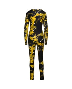 Versace Jeans Couture Black And Gold Log Jumpsuit With ‘chain’ Baroque Motif In Stretch Nylon Woman
