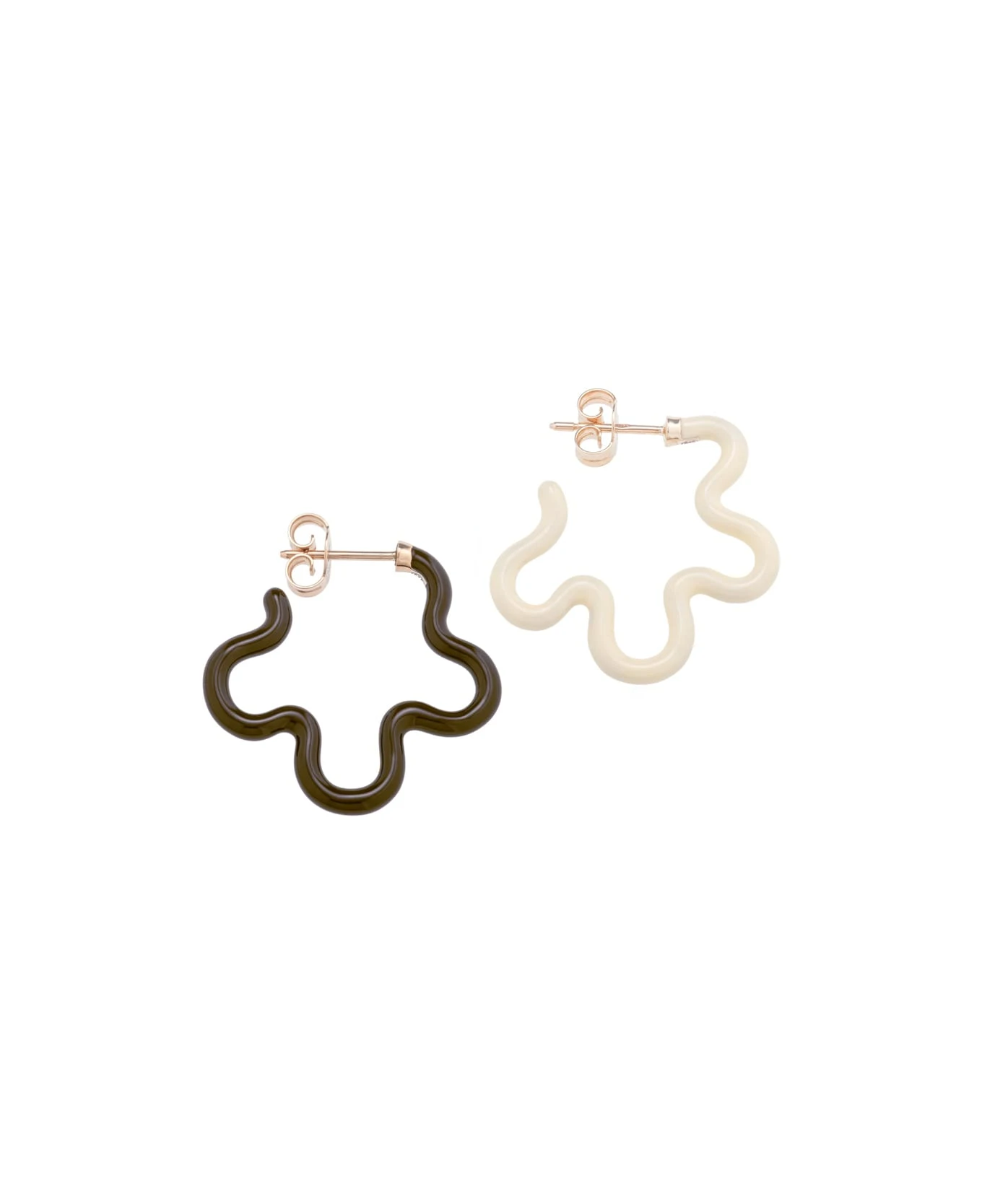 Two-tone asymmetrical flower power earrings by Bea Bongiasca in 9kt yellow gold and silver with cherry chocolate and panna enamel. Please note that the slight change in colour and traces of the craft process are part of the art of hand-painting enamel.