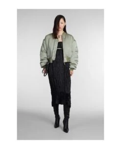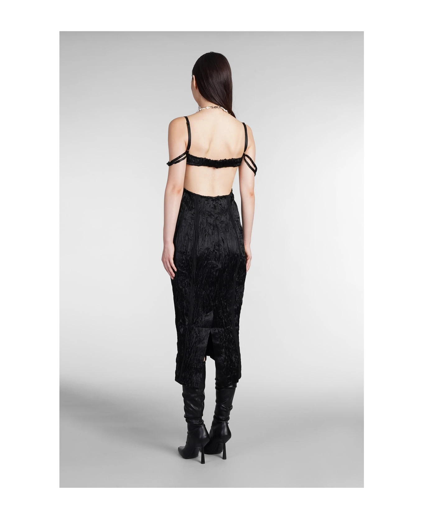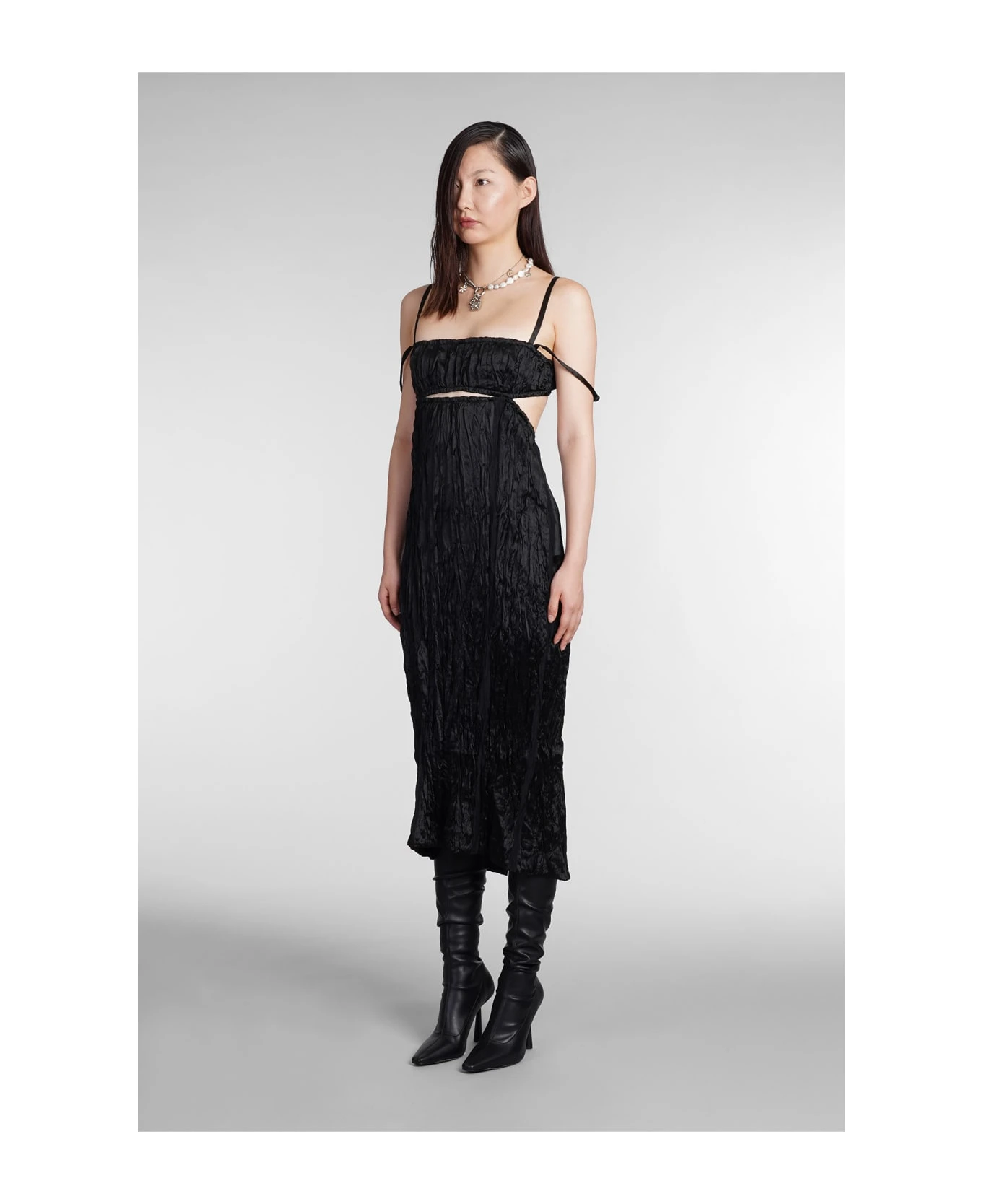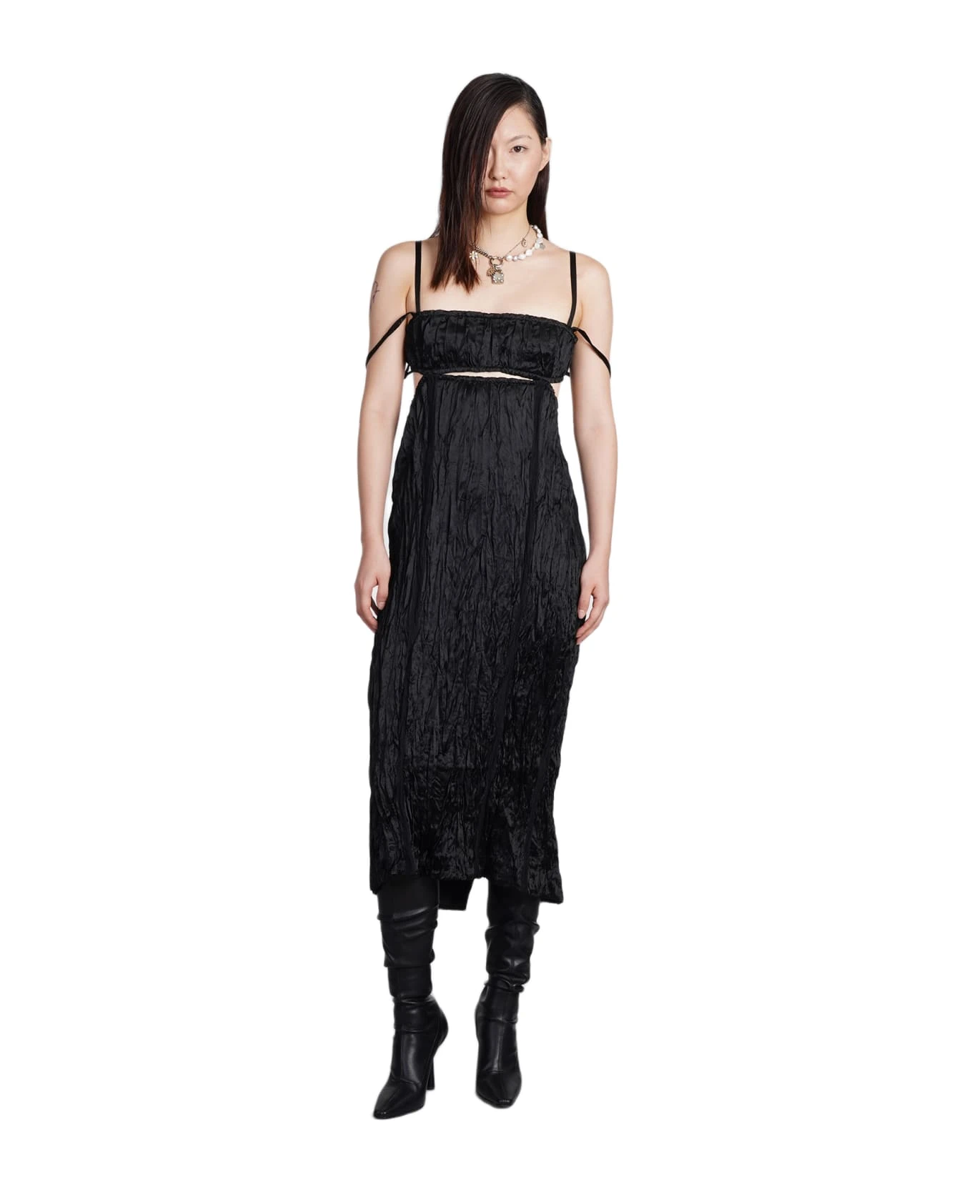 Dress in black acetate, thin straps, cut out detail, crumpled effect, zip clousure, 100% acetate, Made in China, Model is 180 cm and wears 36