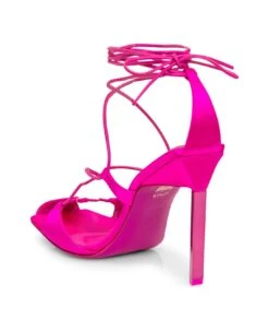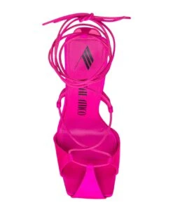 Pink sandal with heel. Triangular heel. Ankle lacing. Logo on the sole.