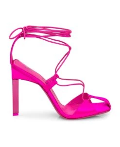 Pink sandal with heel. Triangular heel. Ankle lacing. Logo on the sole.
