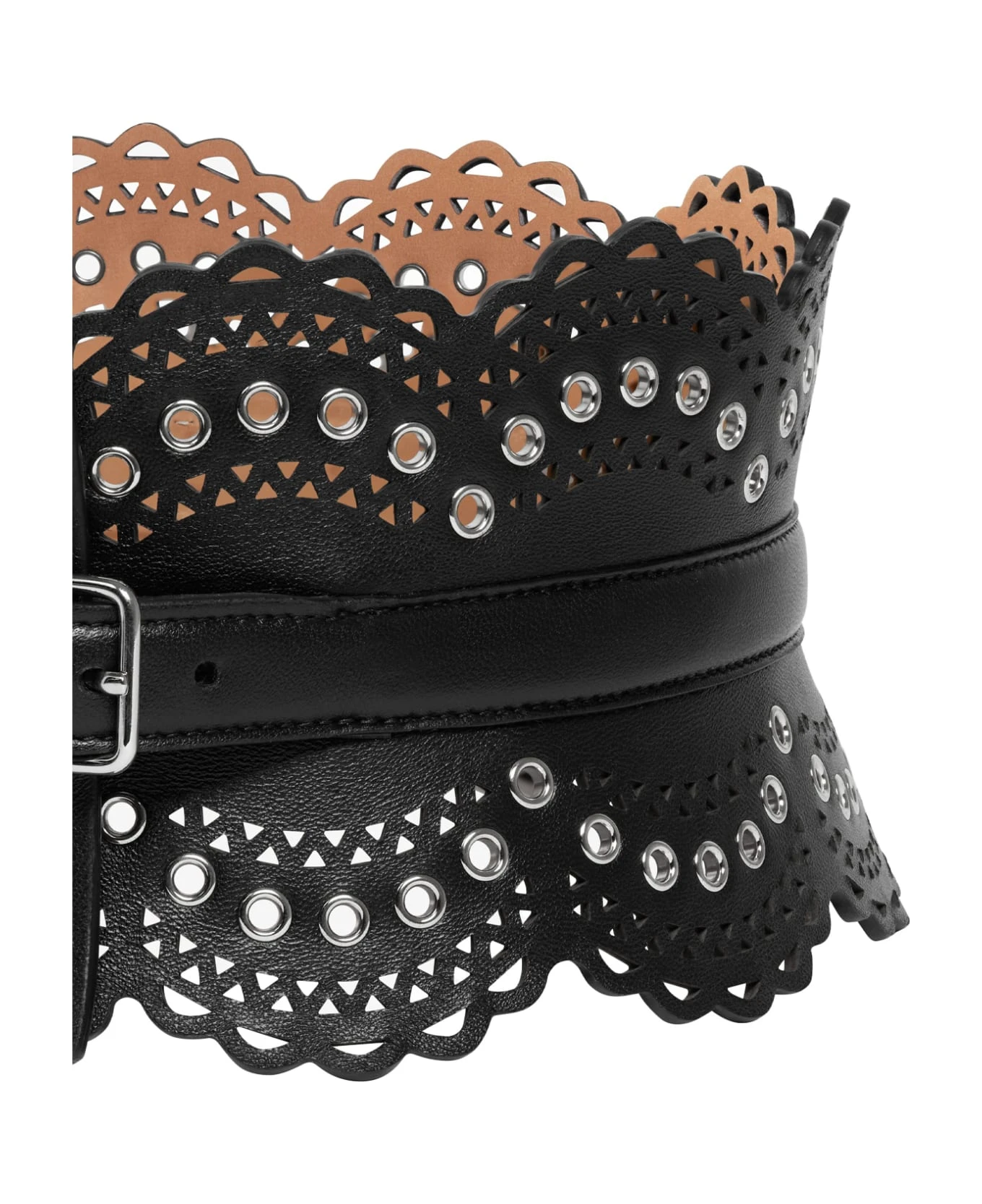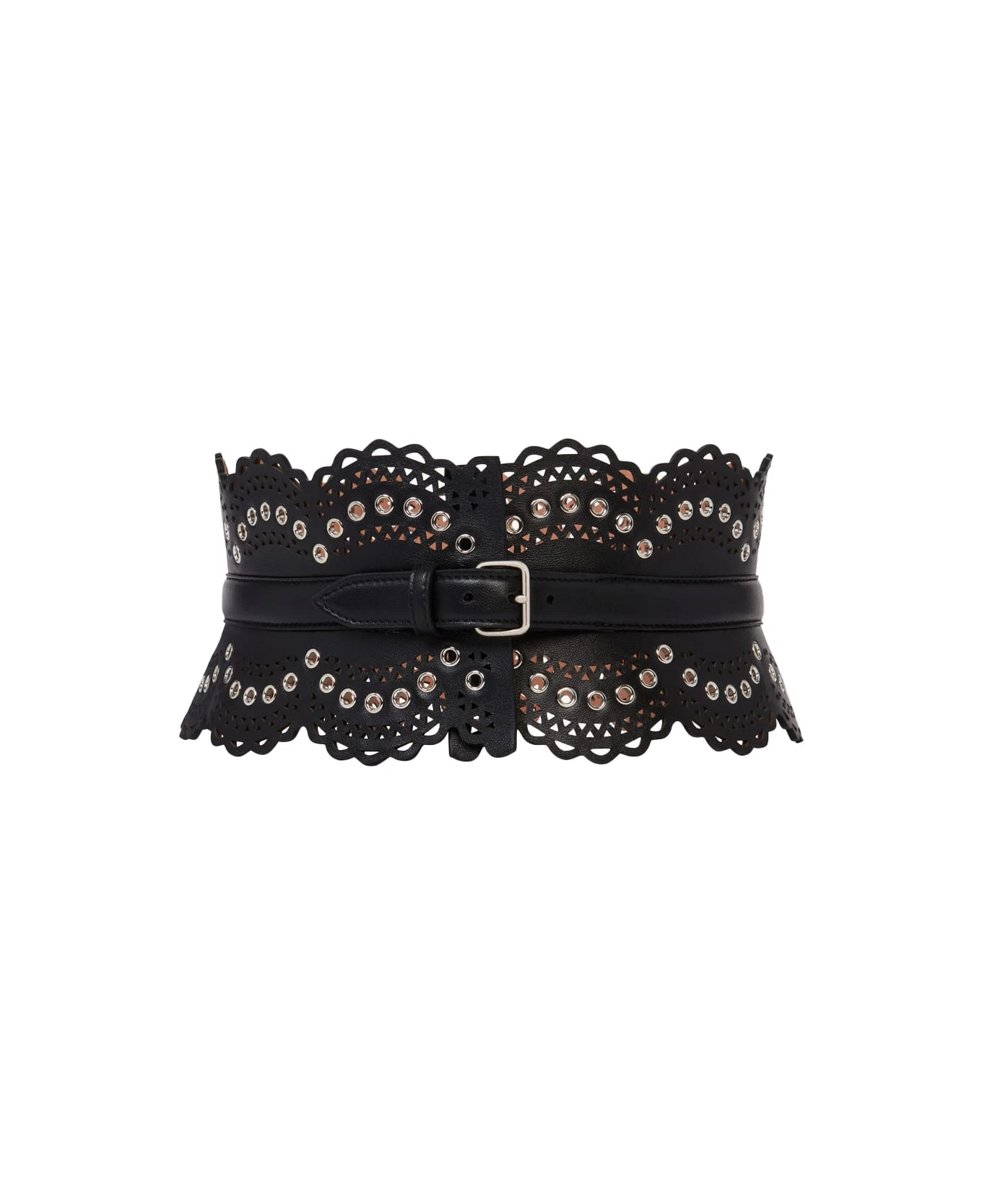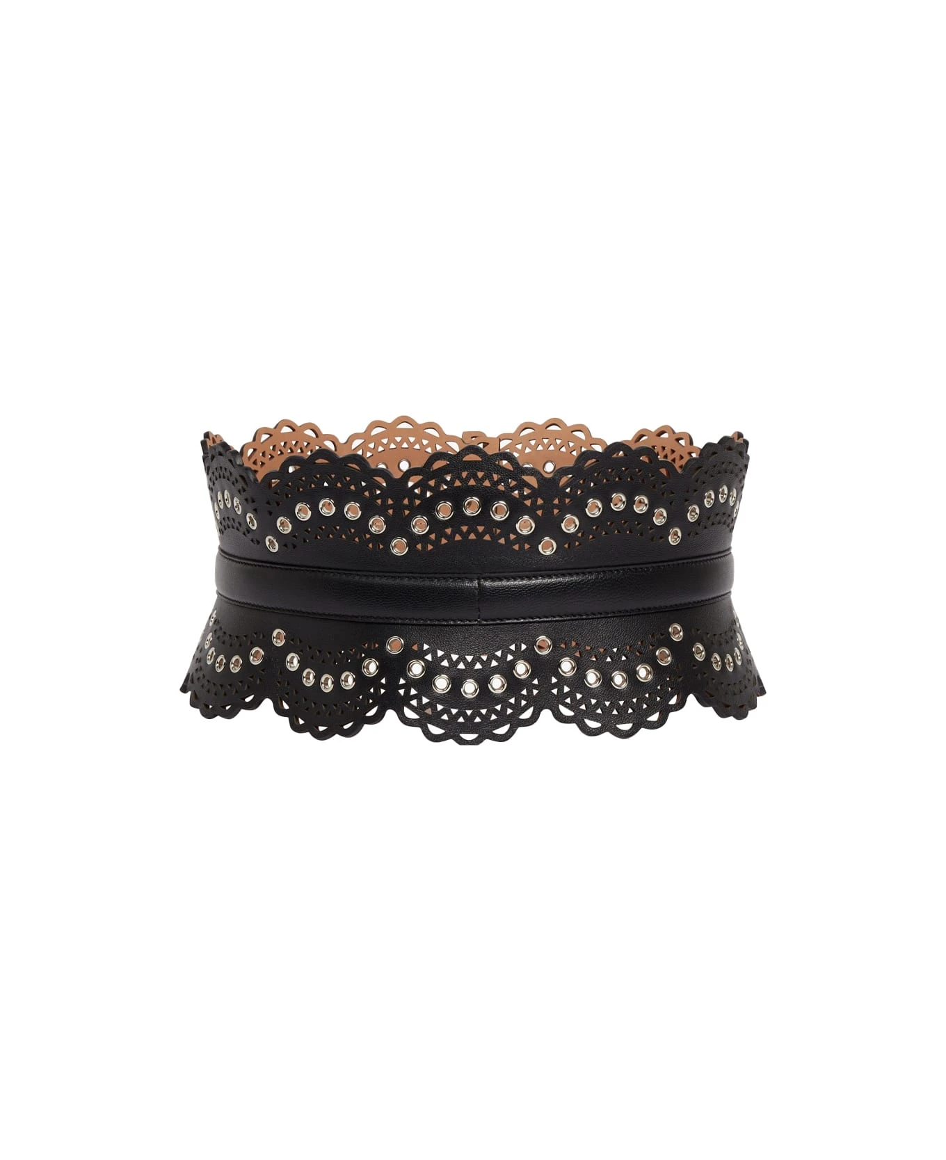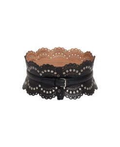 A refined women’s bustier belt from Alaia made of fine black perforated calfskin and finished with a striking design, shaped edges, silver-coloured eyelets and a slim buckle. The product adjusts perfectly at the waist. Belt height: 12 cm.
