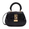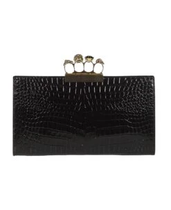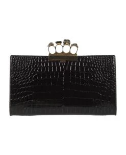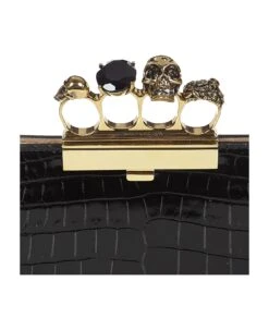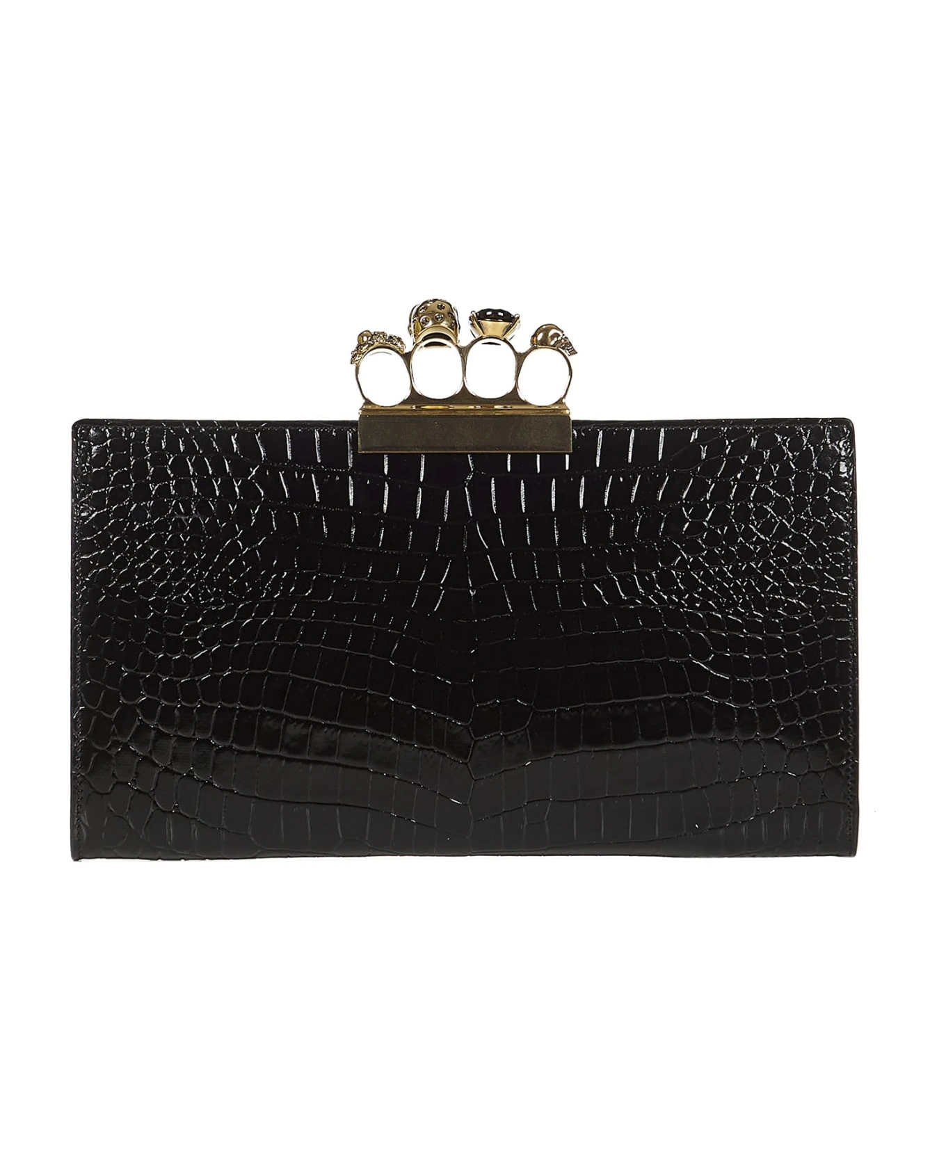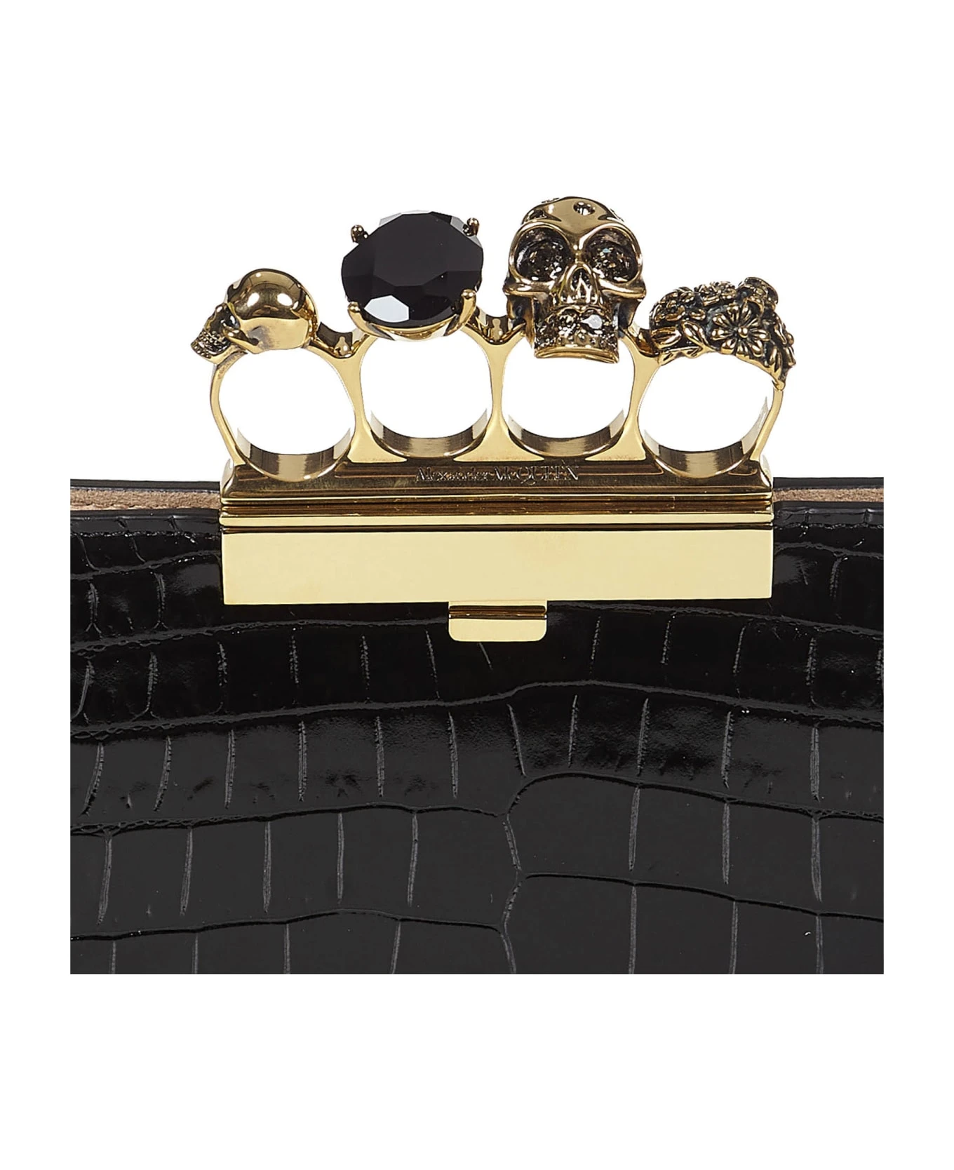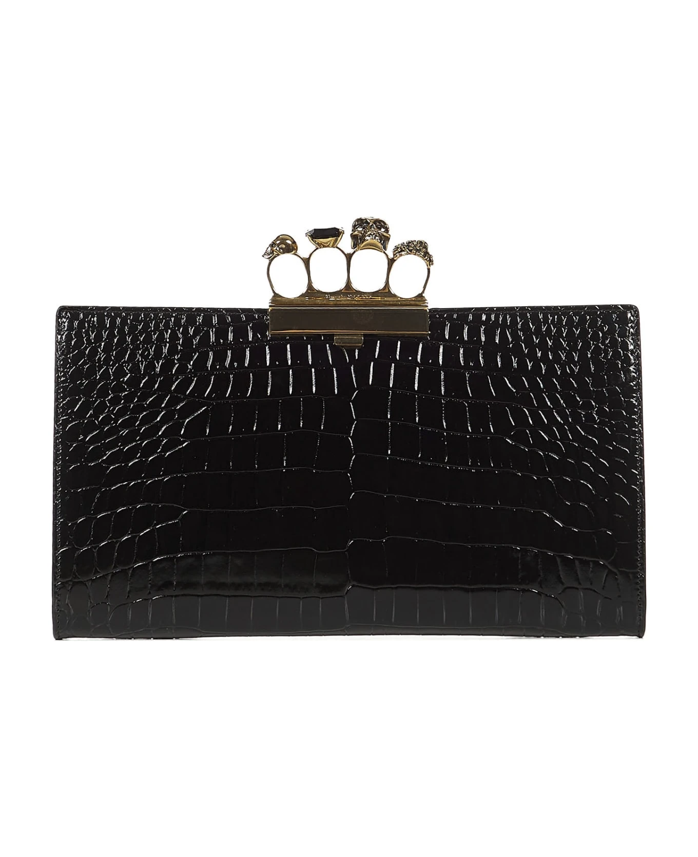 Black leather Four Ring embossed clutch bag from Alexander McQueen featuring embossed crocodile effect, skull stud embellishment, internal zip-fastening pocket and box-clasp fastening. Outer: Calf Leather 100%