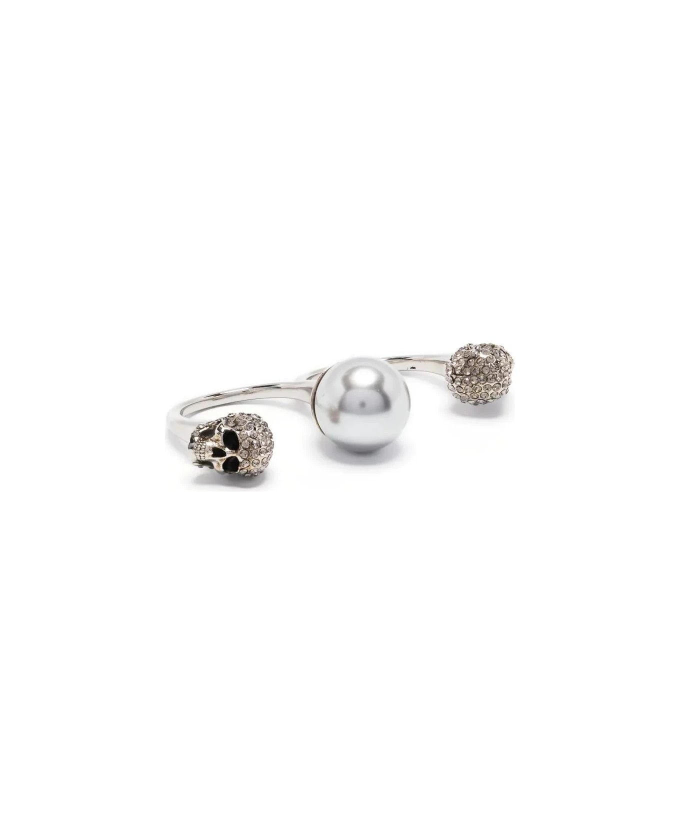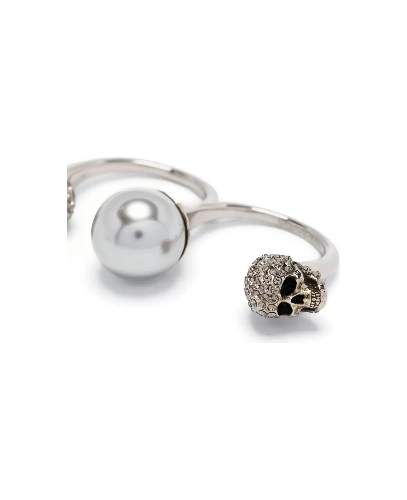 Double ring signed Alexander McQueen made of brass with an antiqued silver finish and embellished with two pavé skulls in Swarovski crystals and pearl-effect white Swarovski crystals. Metal accessories in eco brass.