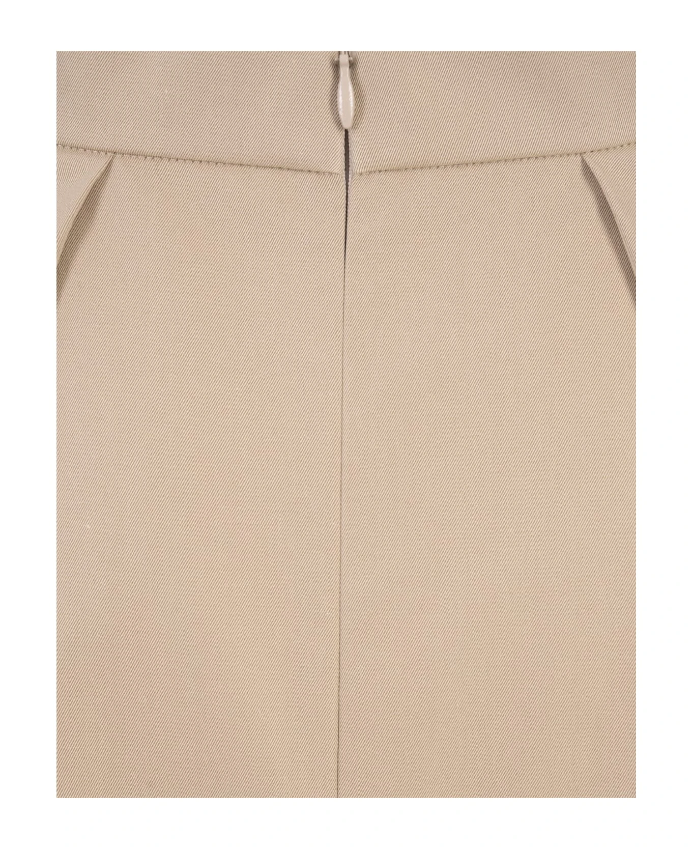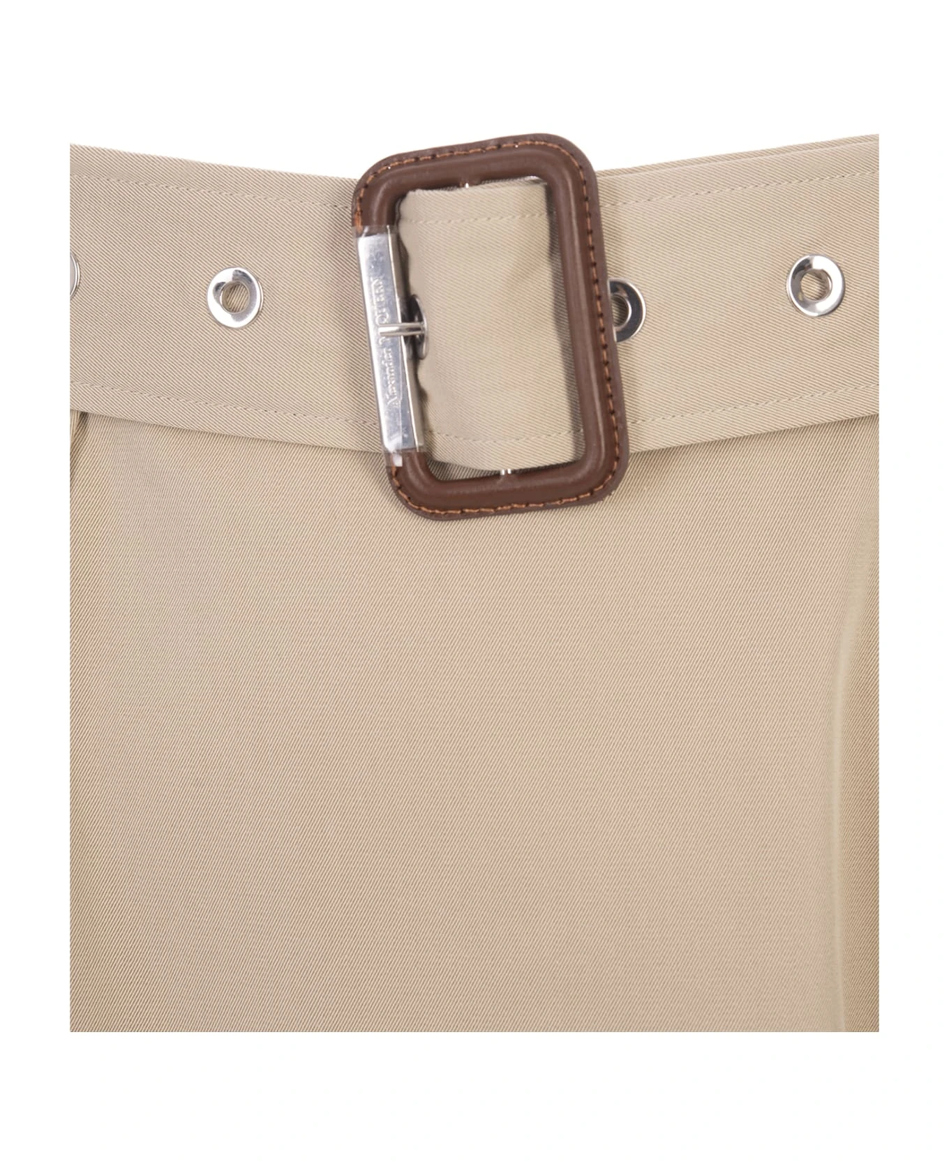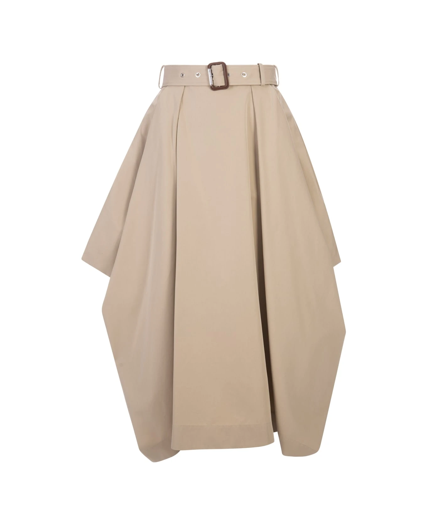 Midi trench skirt by Alexander McQueen made from beige cotton and finished with an adjustable matching belt with buckle. High-waisted design featuring a flared cut, an asymmetric hemline and a pleated design that adds volume at the sides.