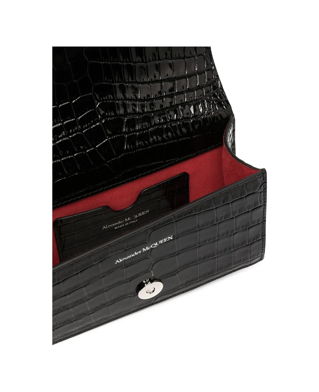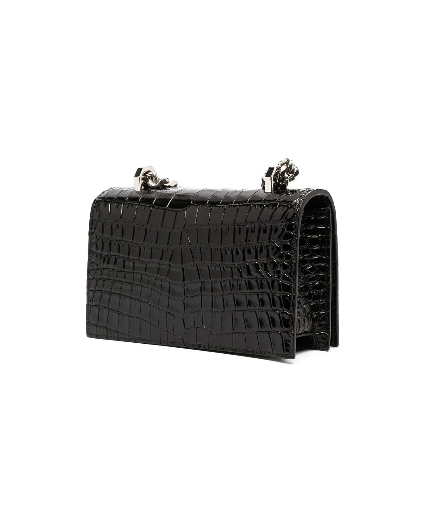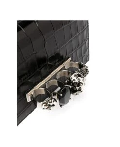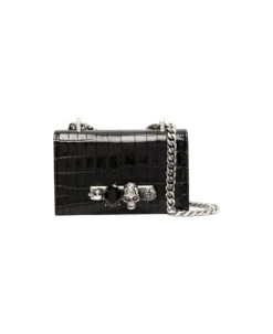 Mini Jeweled Satchel bag for women by Alexander McQueen made of black crocodile-effect embossed calfskin and embellished with four metal rings with Swarovski crystals. Model featuring a chain shoulder strap, snap button flap, suede interior lining, embossed silver Alexander McQueen logo on the inside, a single internal compartment with a credit card slot and silver-finish brass hardware. The bag allows you to store your smartphone and can be worn in various ways: by hand thanks to the jewel detail, on the shoulder or cross-body thanks to the chain shoulder strap.
