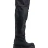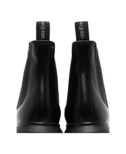 Chelsea boot for women by Alexander McQueen crafted in shiny black calf leather and featuring rounded toe, tonal elasticated side inserts and iconic oversized black rubber sole. Model finished with contrasting Alexander McQueen logo on the tape tongue.