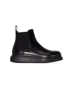 Chelsea boot for women by Alexander McQueen crafted in shiny black calf leather and featuring rounded toe, tonal elasticated side inserts and iconic oversized black rubber sole. Model finished with contrasting Alexander McQueen logo on the tape tongue.