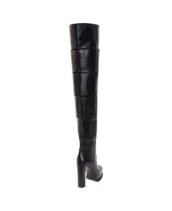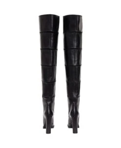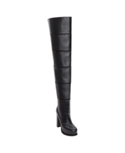 Alexander McQueen platform cuissard boots crafted from black calfskin and inspired by the deconstructed silhouettes of the ready-to-wear tailoring line. They boast a slip-on design with cut-out detailing. Square leather sole and 120 mm high laminated leather heel. Adjustable internal strap closure at the top of the boot.
