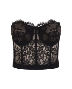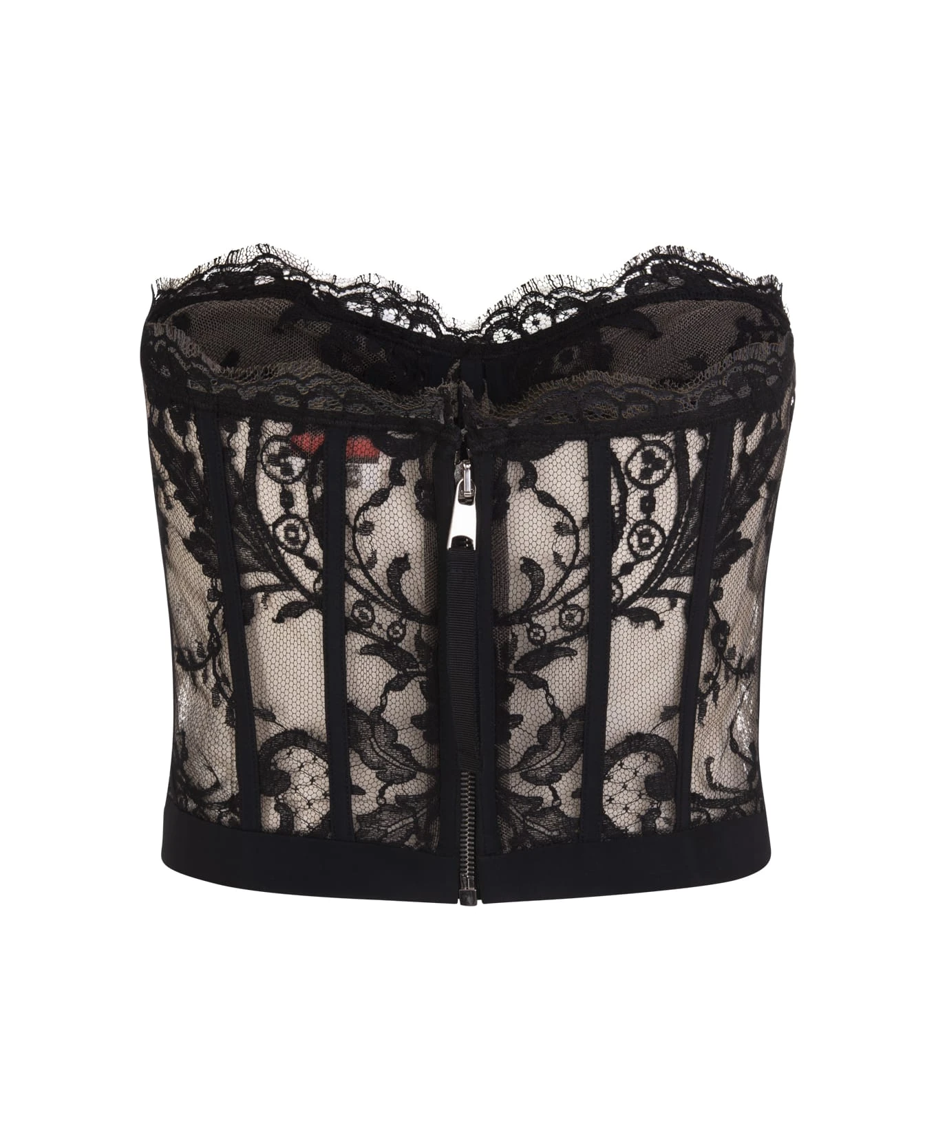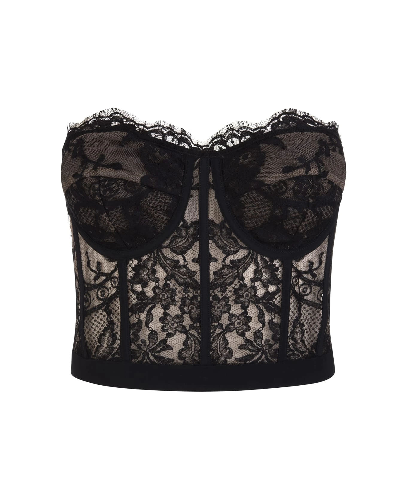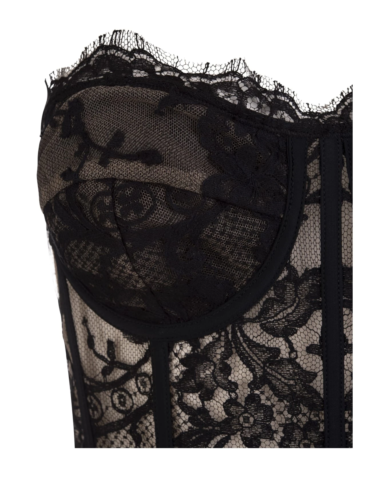 Underwired corset top by Alexander McQueen crafted in black lace on a nude fabric base. Model featuring a sleeveless design, a sweetheart neckline, a scalloped lace trim and a concealed zip back closure.