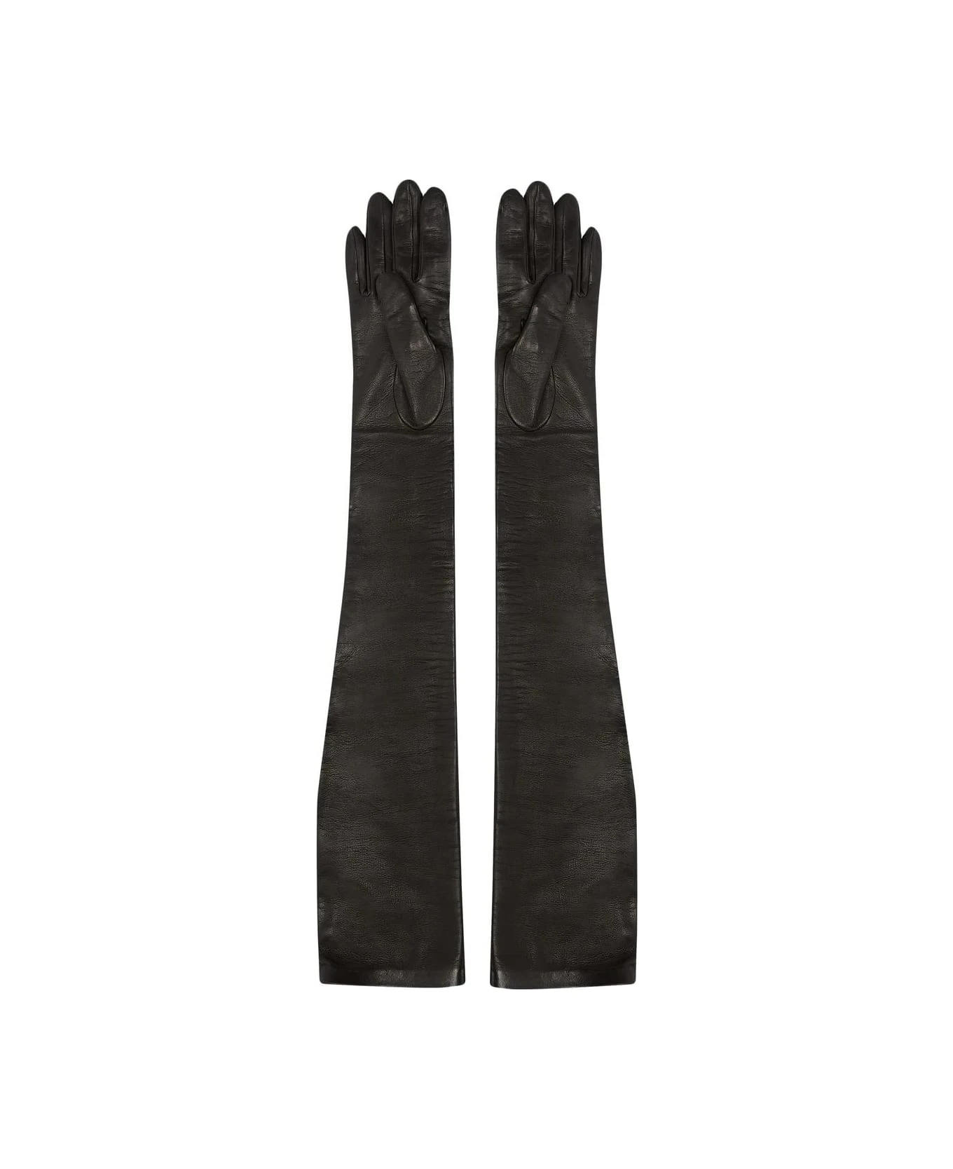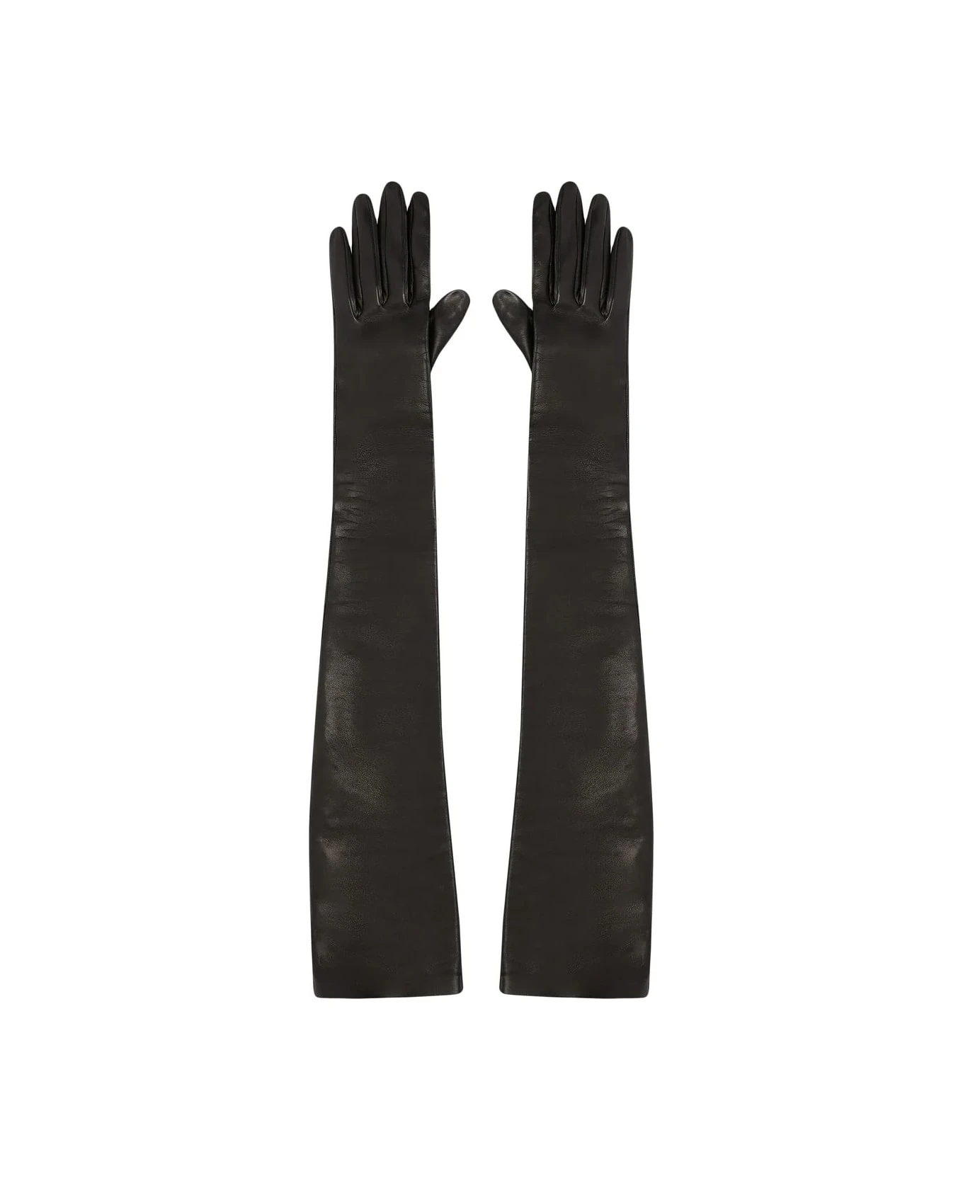Alexander McQueen fitted gloves made of black lambskin leather with Alexander McQueen signature embossed on the base. The model is worn above the elbow.
