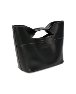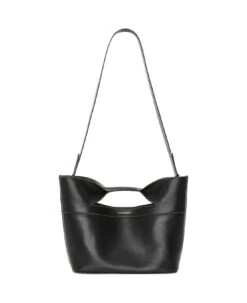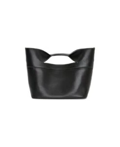 The Bow small bag signed Alexander McQueen made of smooth black calf leather and finished with contrasting stitching and golden Alexander McQueen signature. Model featuring a magnetic closure, rolled top handle, single main compartment, internal suede lining, a removable and adjustable leather shoulder strap (50 cm) and a matching detachable pouch with zip fastening and an external card slot.
