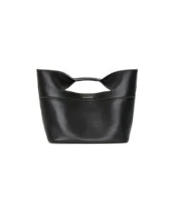 The Bow small bag signed Alexander McQueen made of smooth black calf leather and finished with contrasting stitching and golden Alexander McQueen signature. Model featuring a magnetic closure, rolled top handle, single main compartment, internal suede lining, a removable and adjustable leather shoulder strap (50 cm) and a matching detachable pouch with zip fastening and an external card slot.