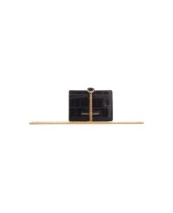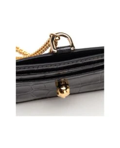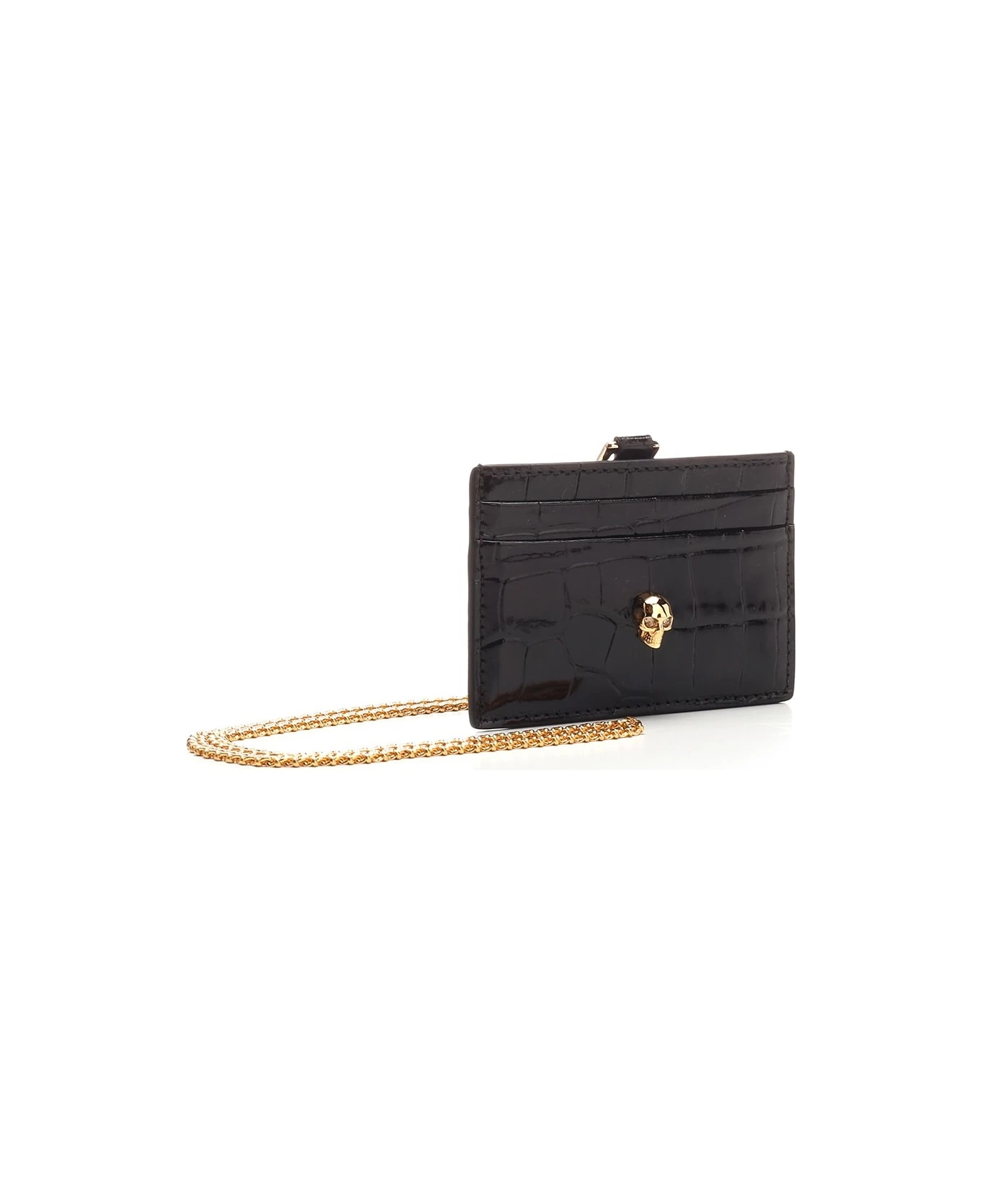 Crocodile effect embossed leather card holder from Alexander McQueen, with golden chain and 3 spaces for cards.