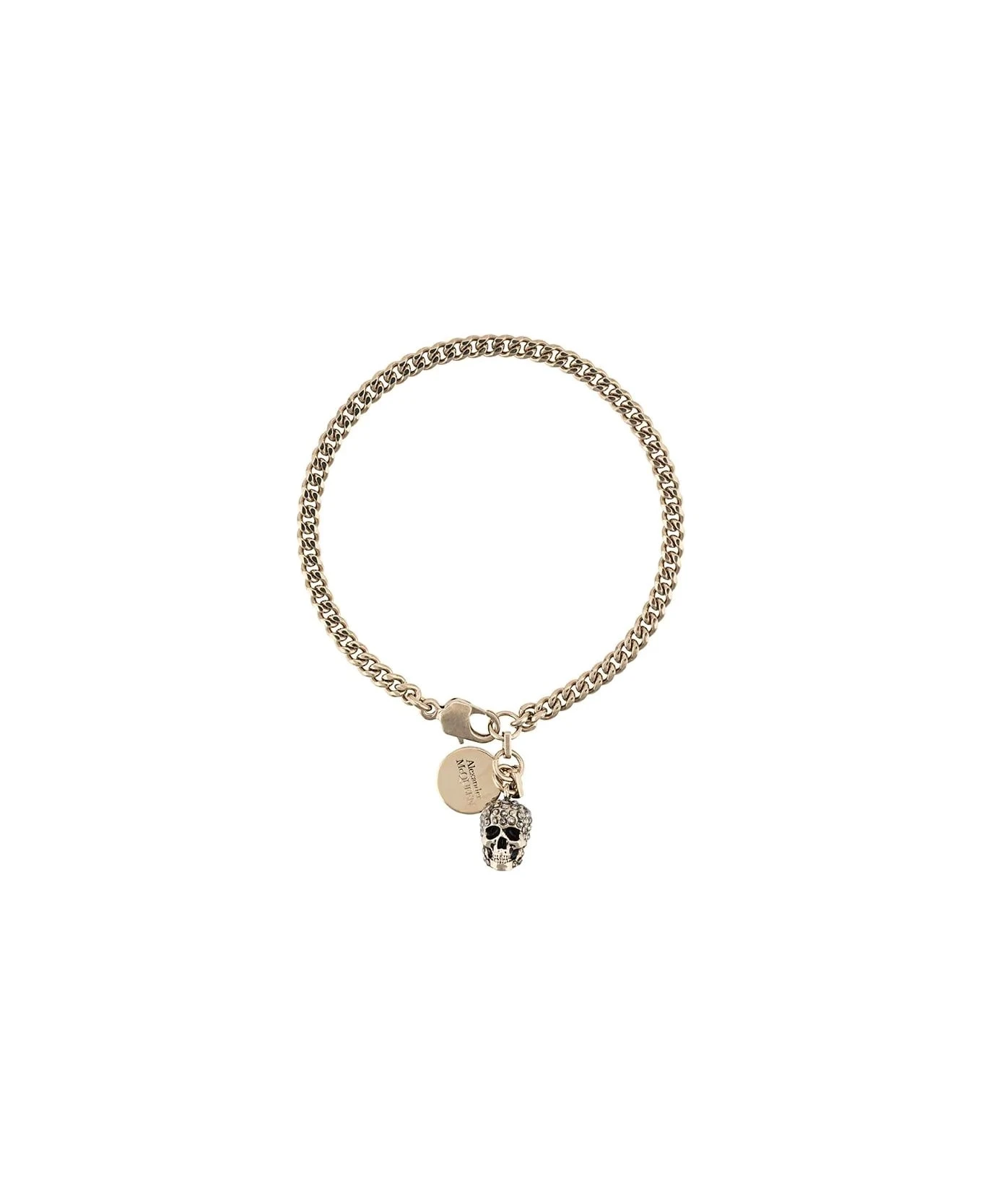 Skull chain bracelet by Alexander McQueen made of brass with a golden finish and embellished with a skull paved with Swarovski crystals. Adjustable fit.