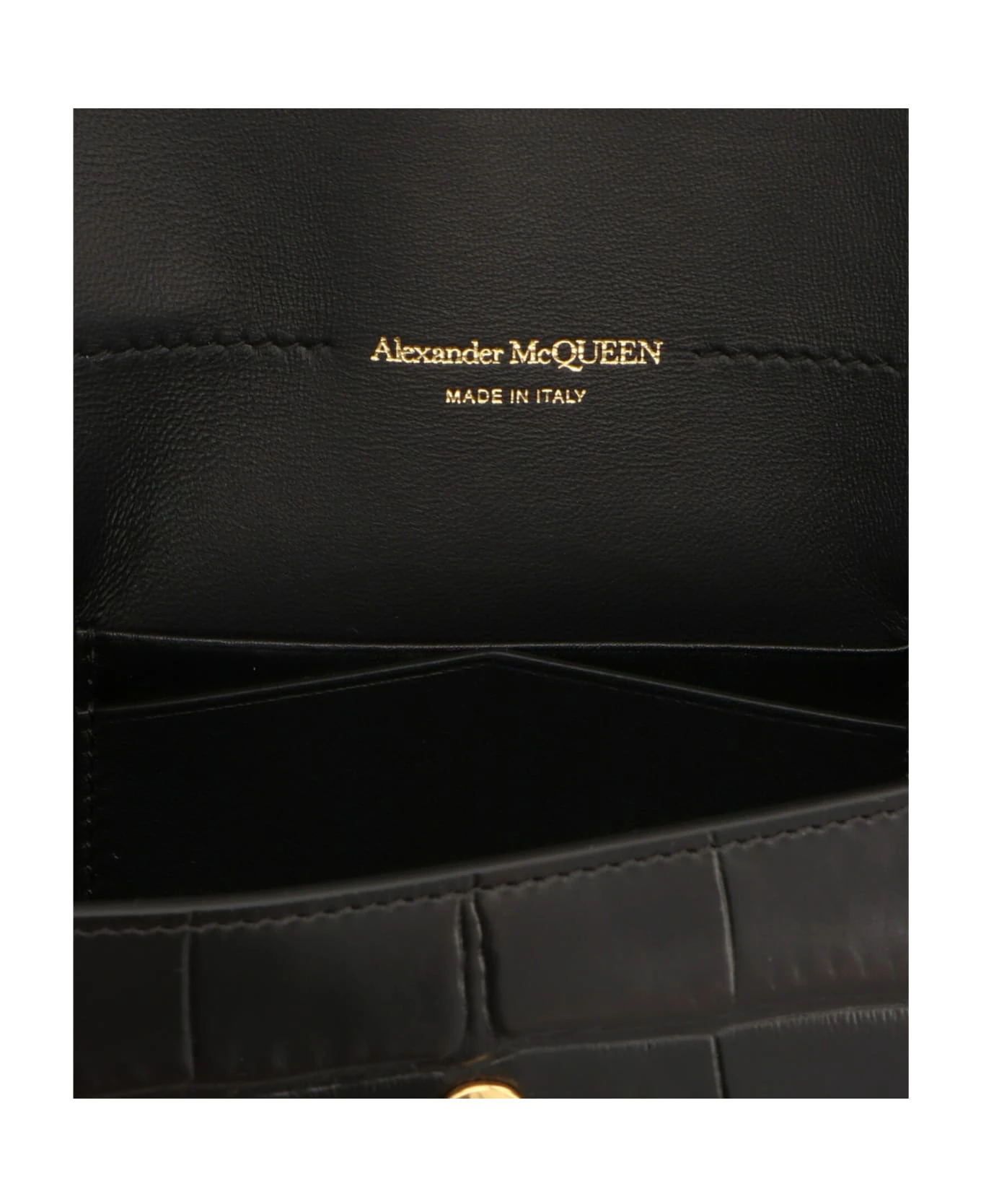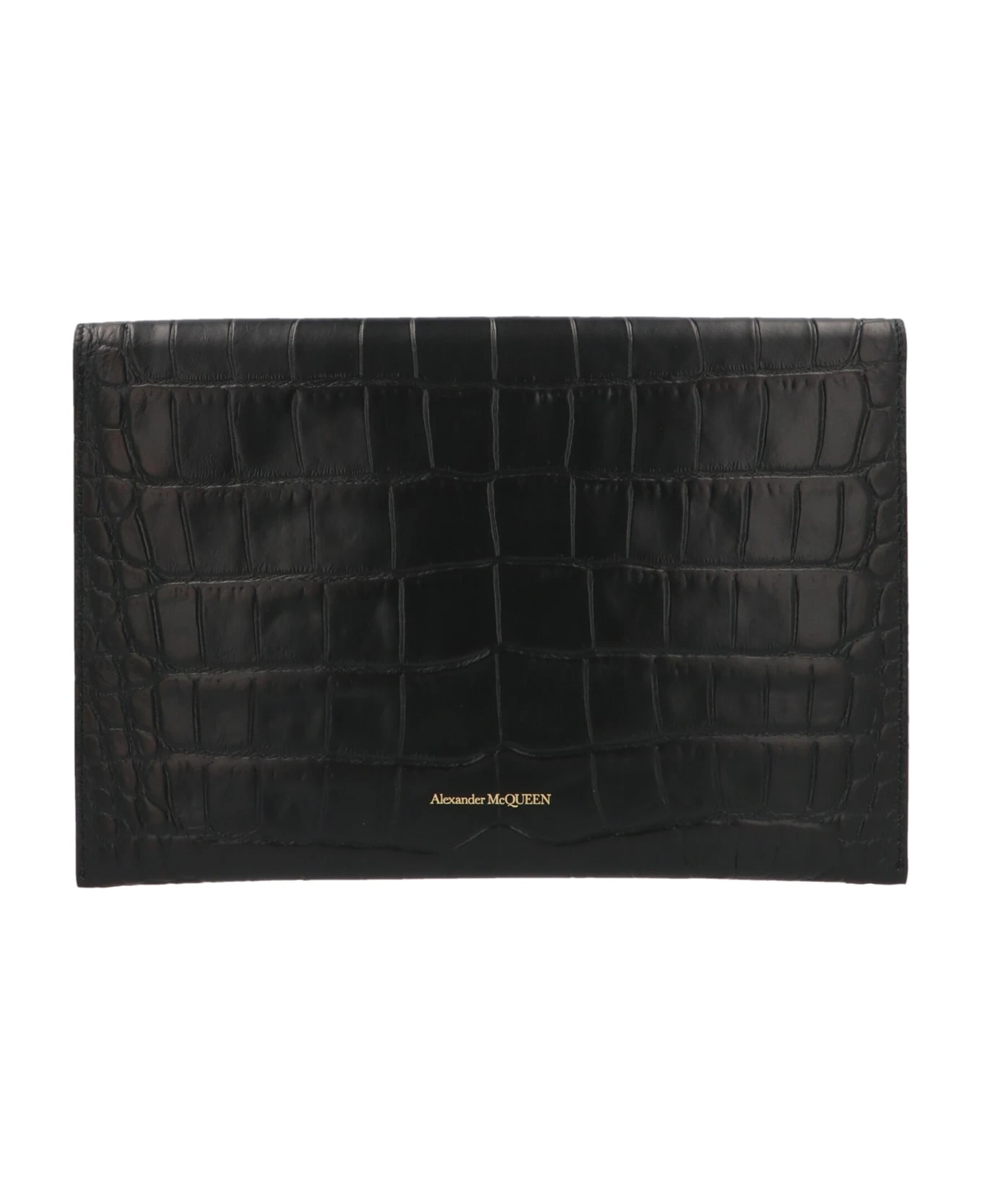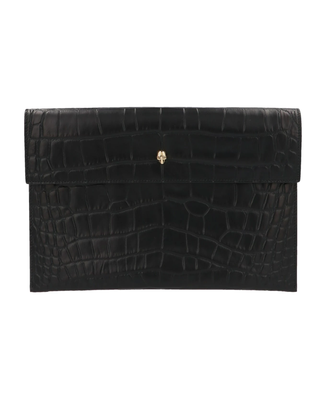 Alexander McQueen ‘Envelope’ clutch with gold metal skull detail, crocodile print and flap closure.