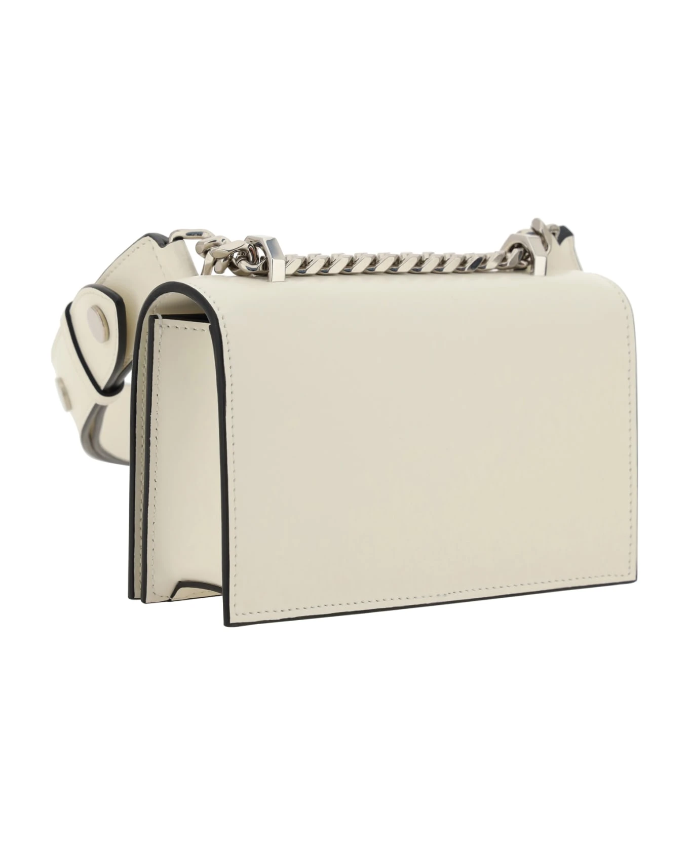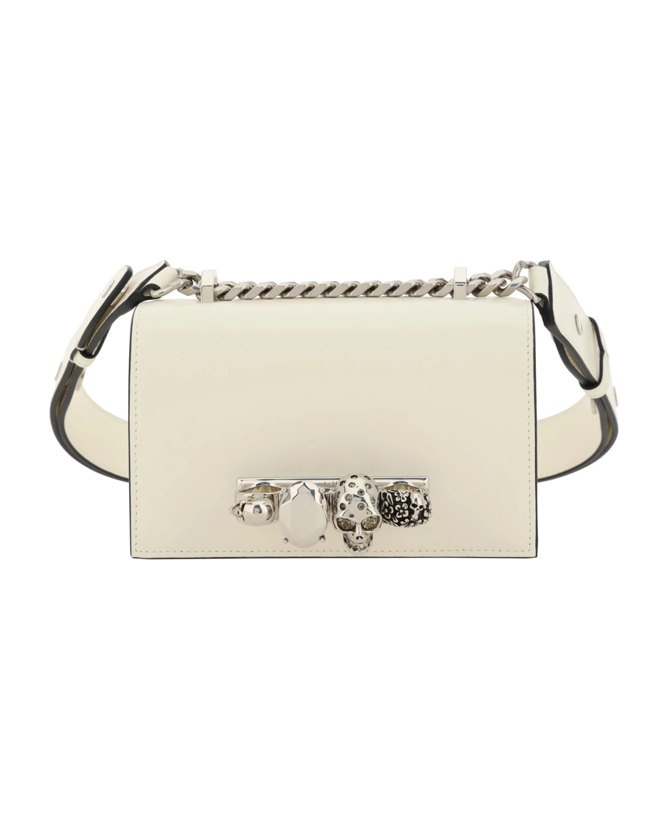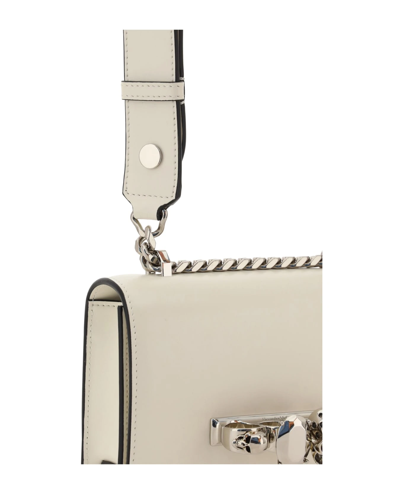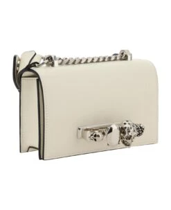 Calfskin jewelled satchel shoulder clutch by alexander mcqueen, smooth leather design, front closure by magnetic flap, single interior compartment, iconic jewelled skull handle on front, sliding chain shoulder strap with adjustable leather insert.