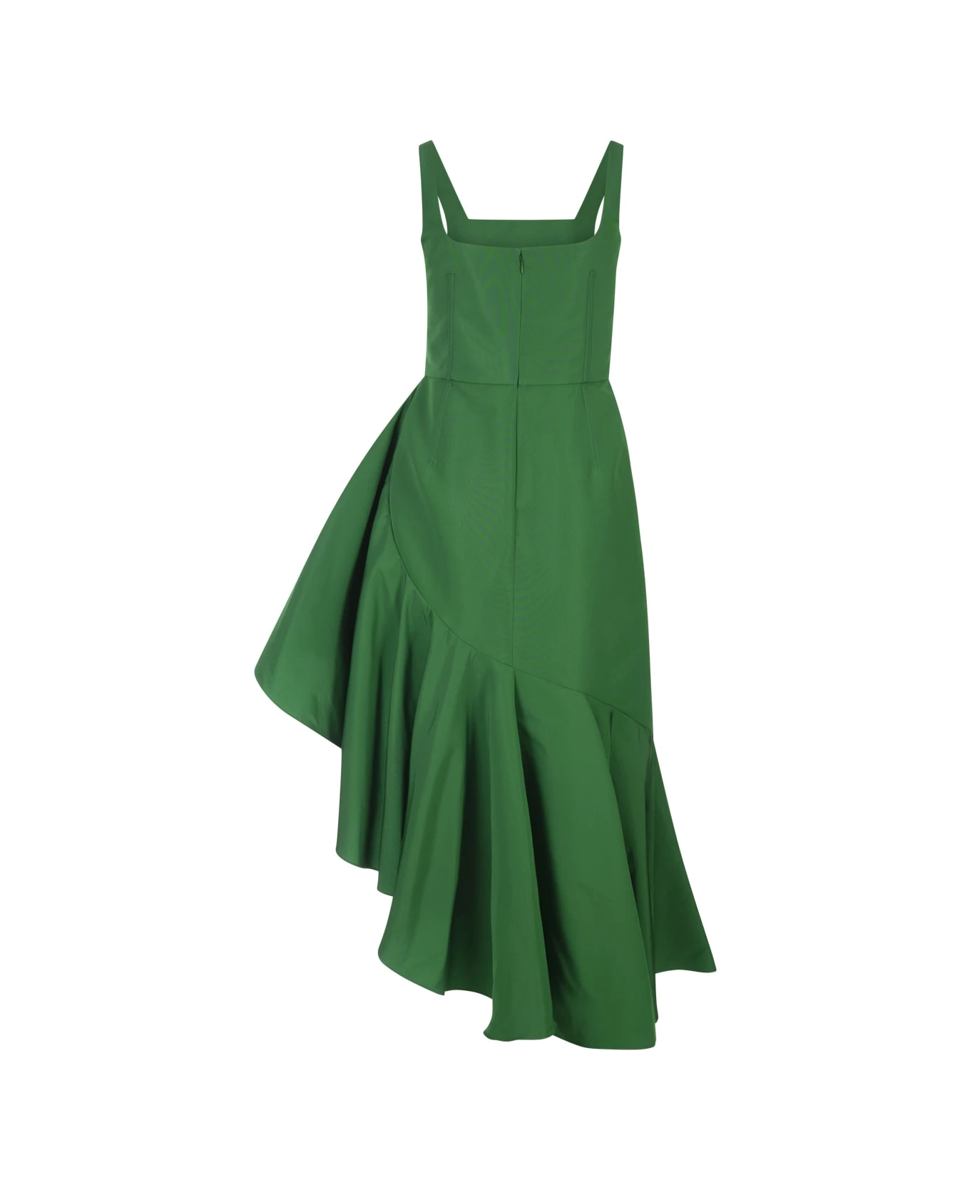 Alexander McQueen sleeveless dress in green polyfaille featuring a square neckline, asymmetric draped details and a back zip fastening. Article made from recycled yarn.