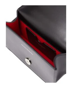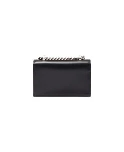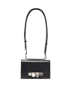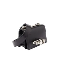 Mini Biker Jewelled Satchel bag by Alexander McQueen made of black calf leather with leather lining, one main compartment, one credit card slot, wide leather shoulder strap in biker style (55 cm) and metal handle in antique silver finish with Swarovski-embellished rings. Thanks to the silver-tone press studs, the leather shoulder strap can be adjusted to various lengths. It can be worn on the shoulder or cross-body. Alternatively, it can be carried by the right handle. Brass metal fittings with antique silver finish. Allows smartphone to be stored. Due to the appearance of the product, it is recommended to carry it in your hand luggage when passing through airport security. For the same reason, we recommend not carrying the bag in public places, such as courthouses and sports stadiums, where security checks may be carried out.