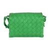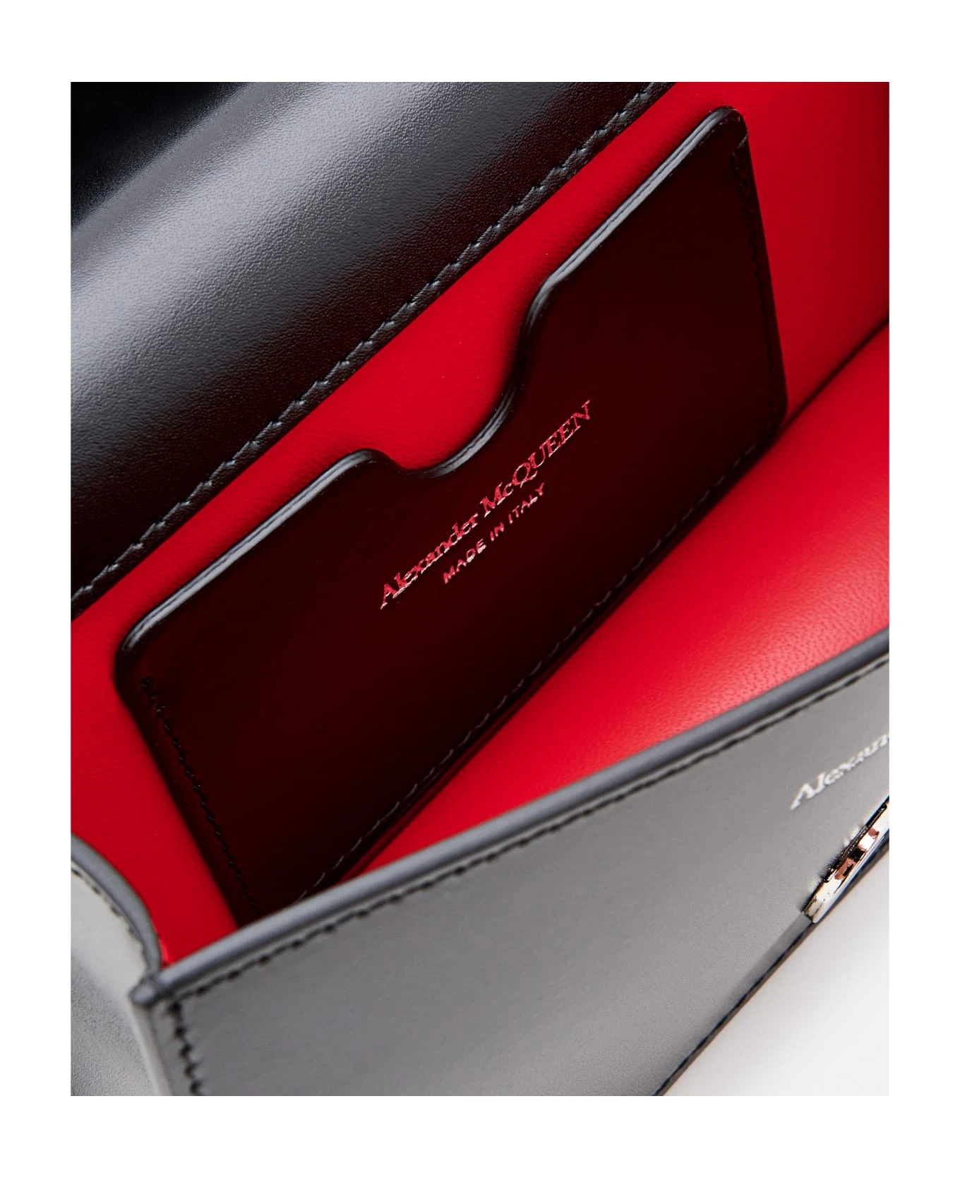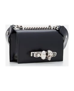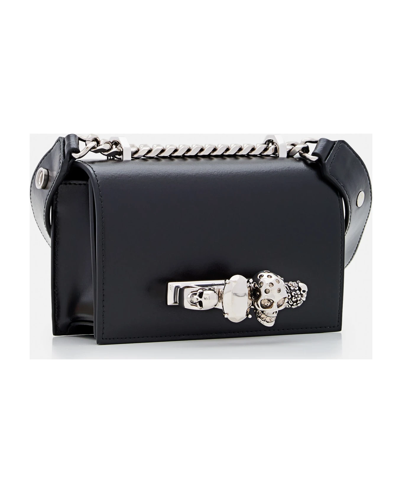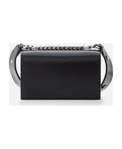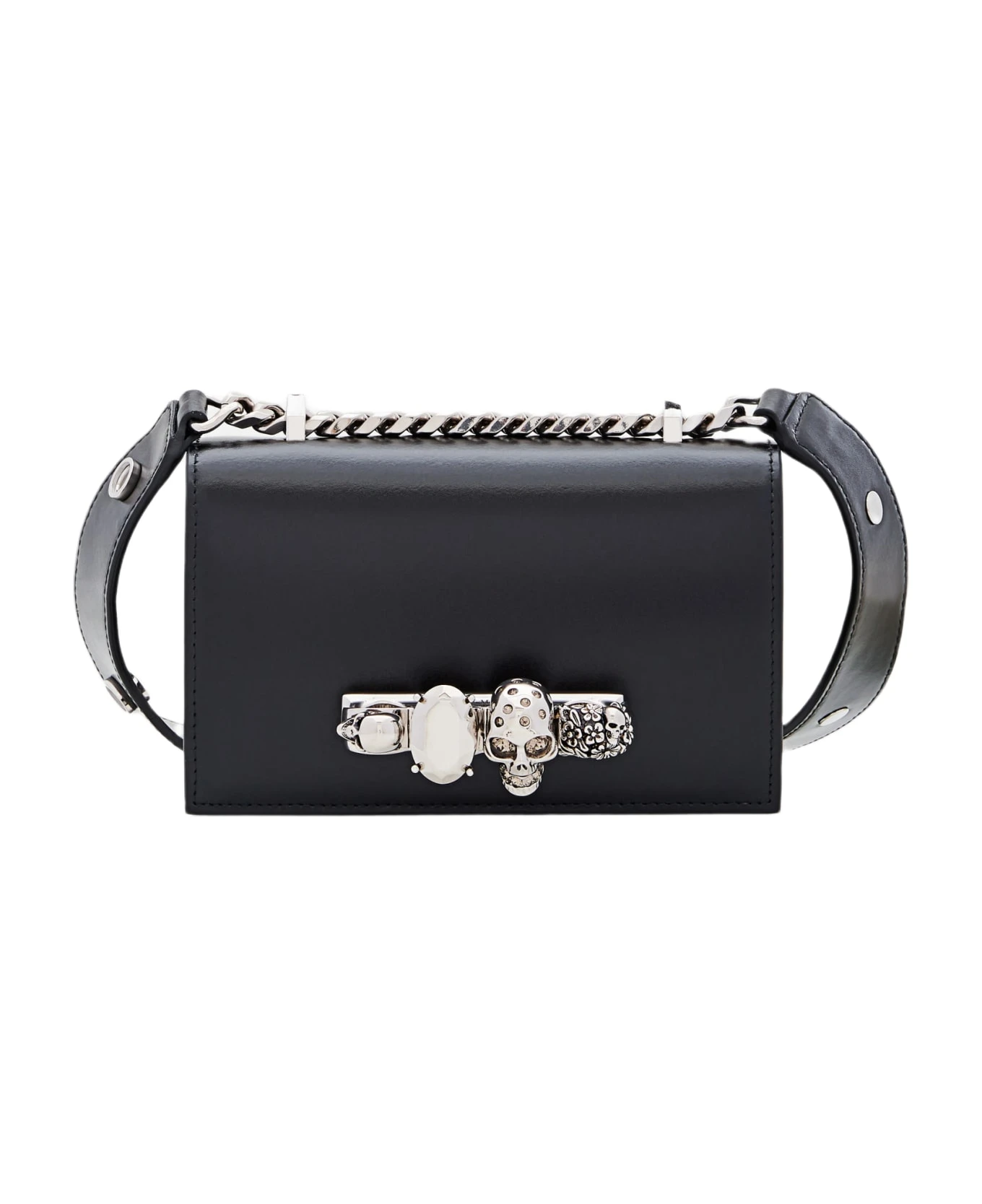 Silver four-ring embellishment encrusted with Swarovski crystals. One main compartment and one card slot. Adjustable leather and chain strap. Brass hardware with antique silver finish. Suede-effect lining. Color: black.
