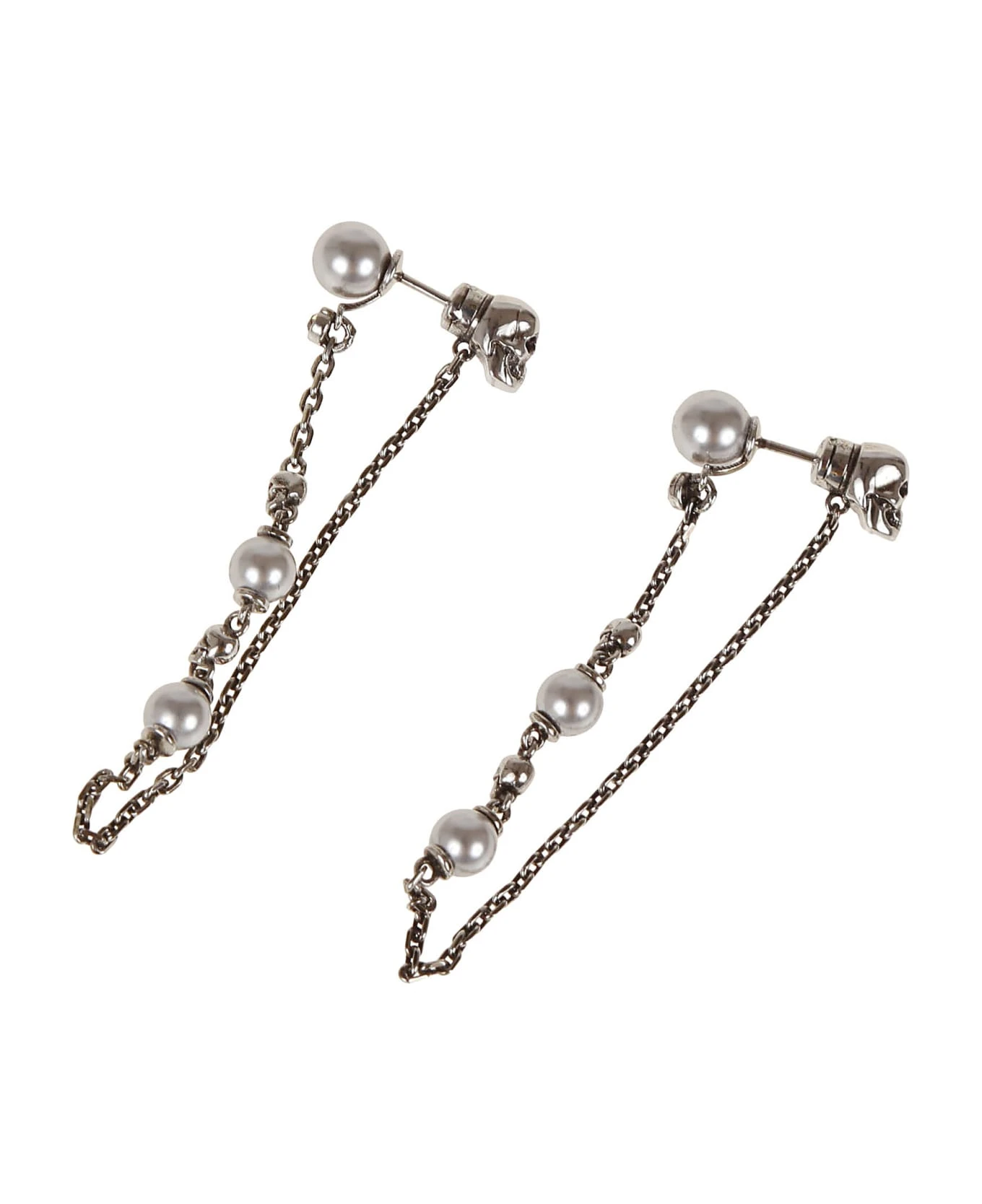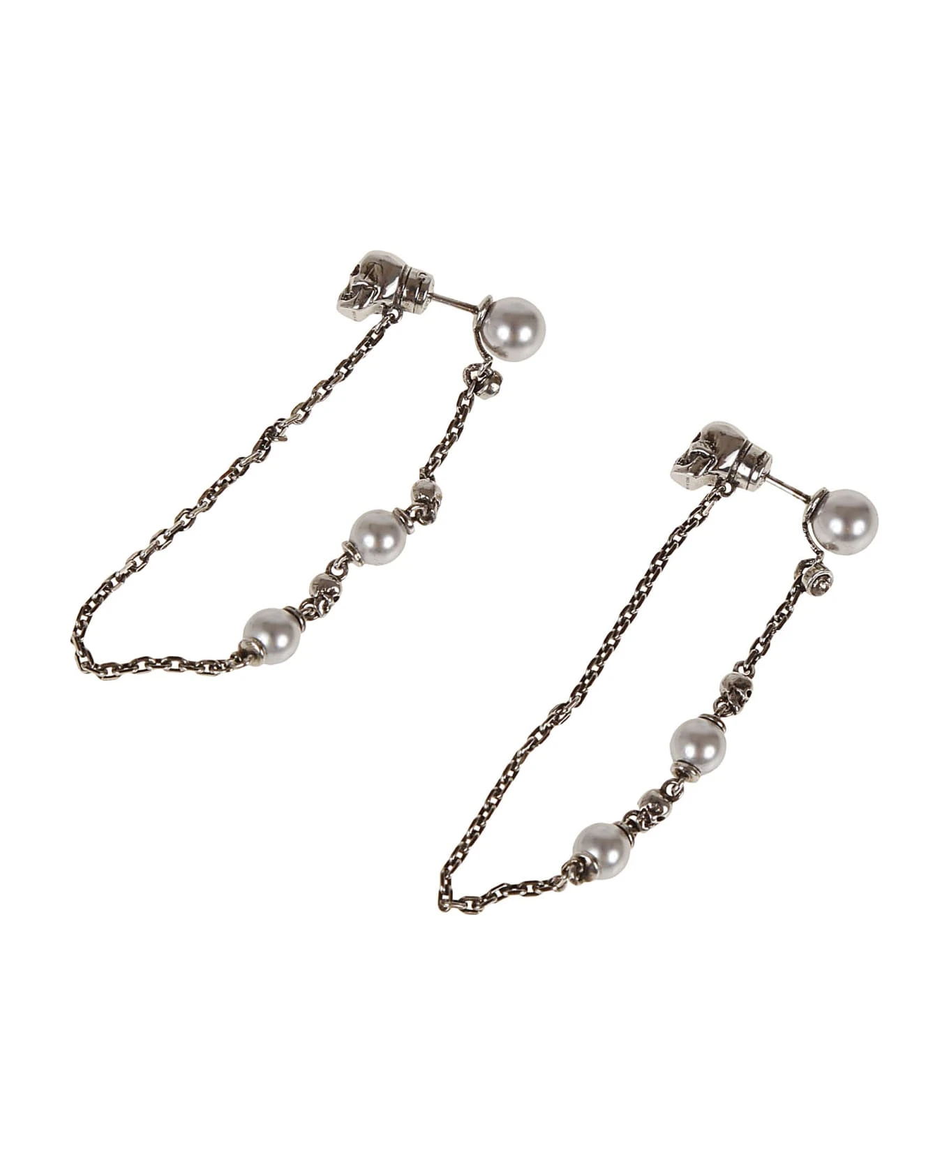 Pendant earrings with antique silver finish chain BY ALEXANDER MCQUEEN. Metal accessories in eco-brass. Embellished with metal skulls and white pearl effect Swarovski.
