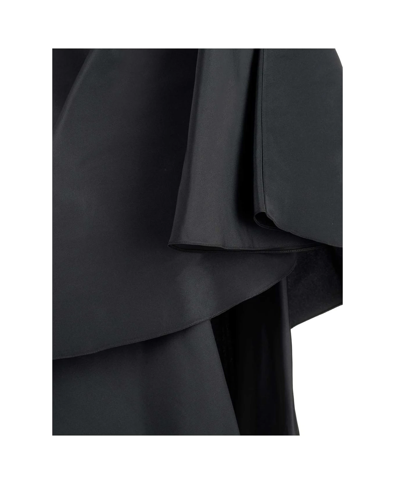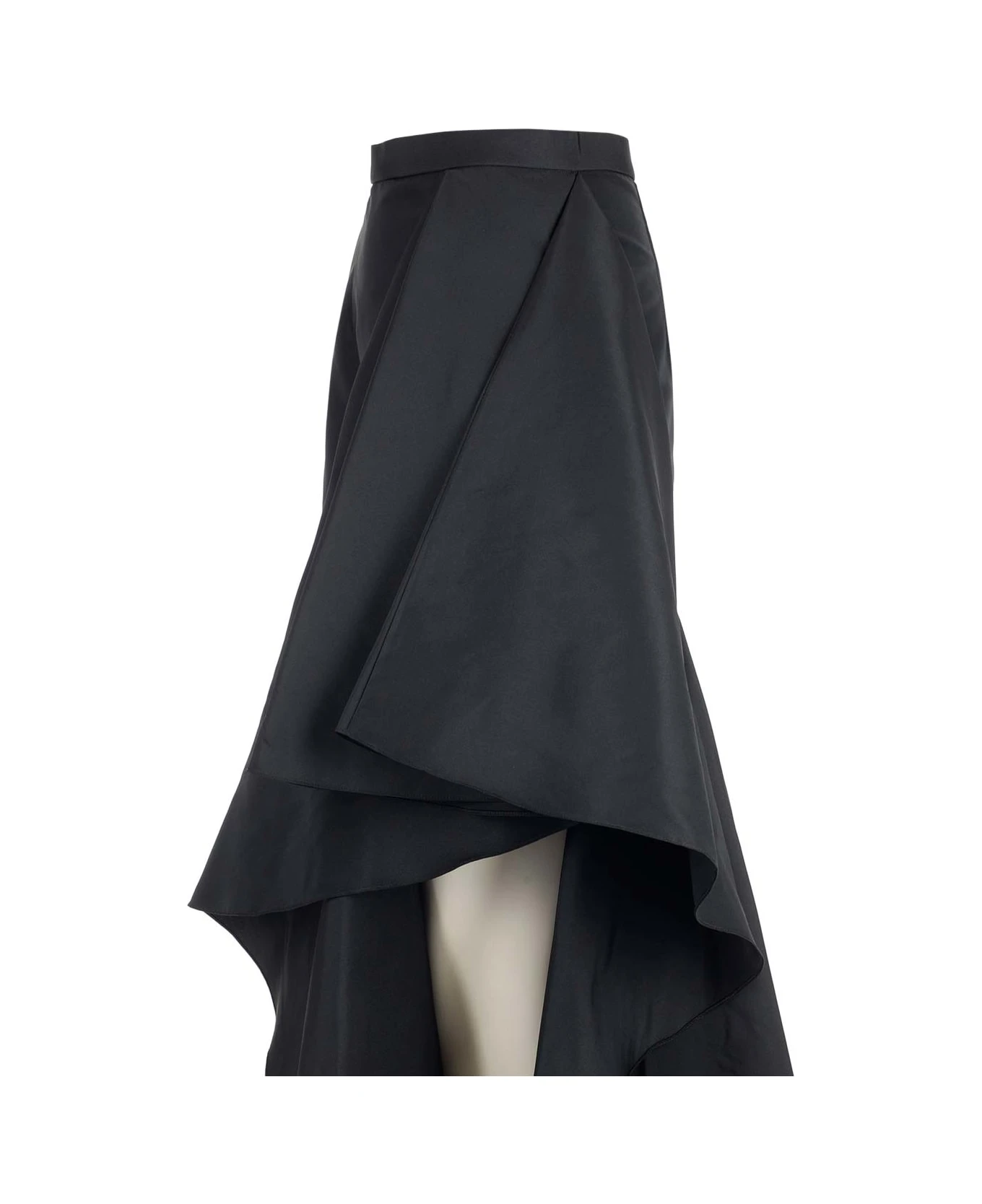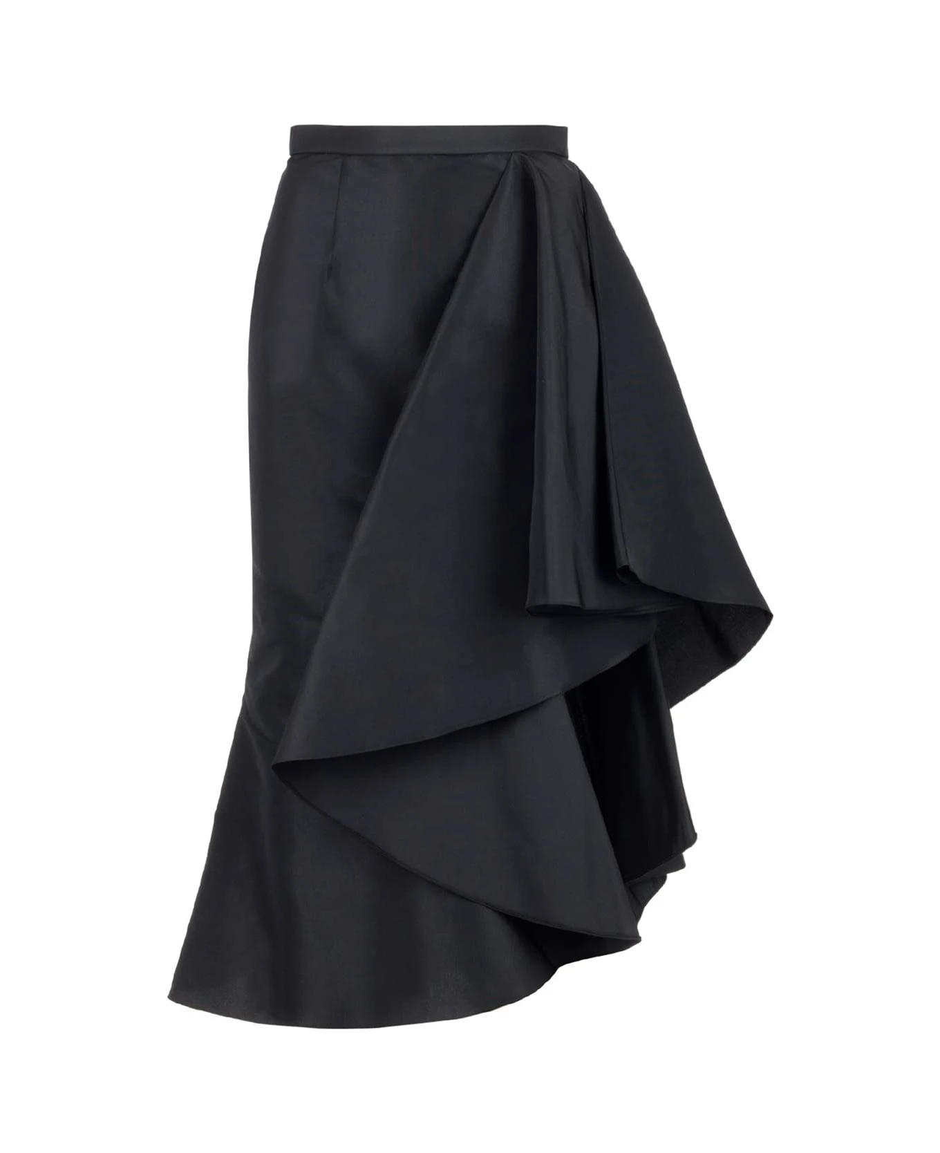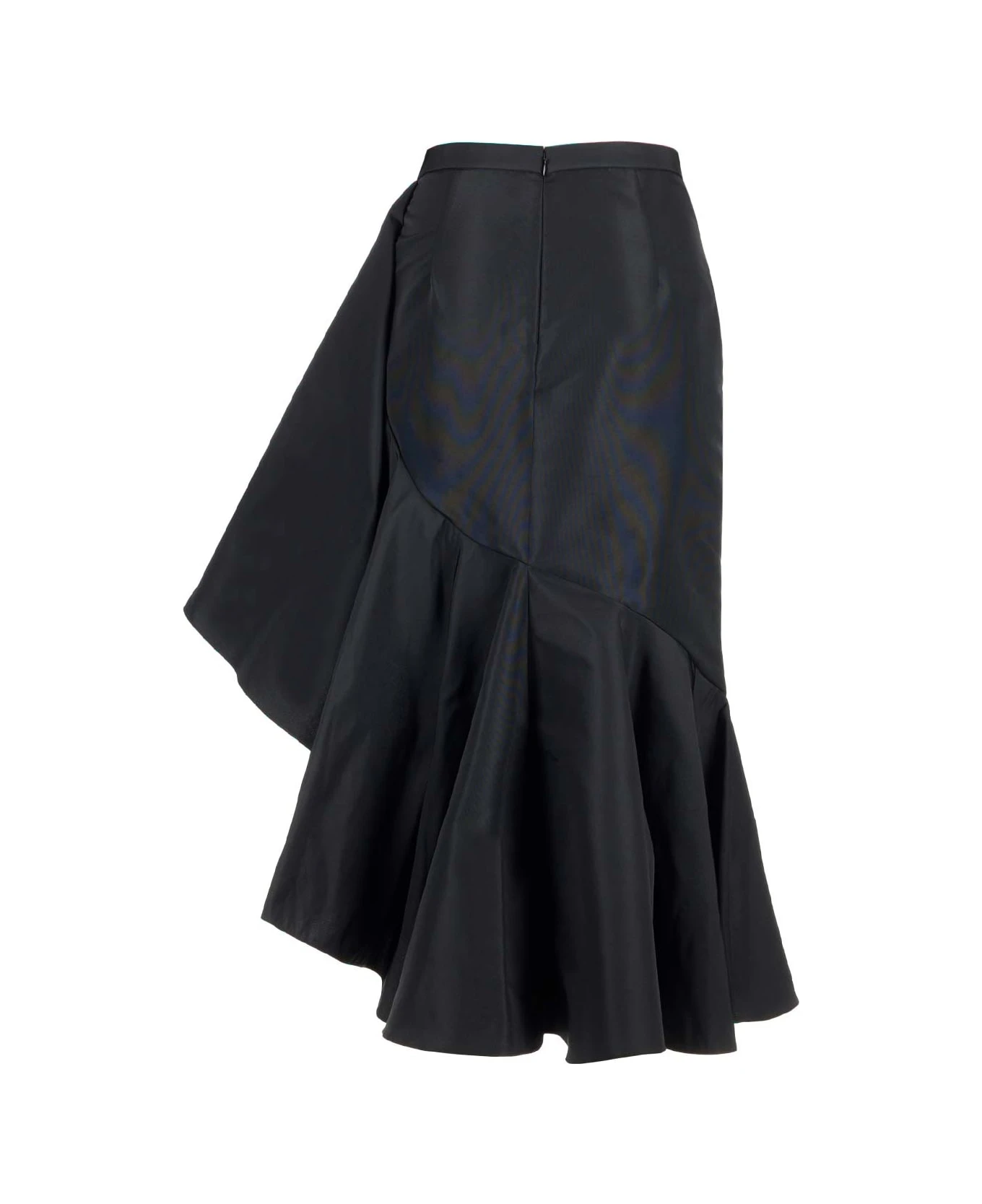 Black polyfaille midi skirt from Alexander McQueen with asymmetrical draped details and back zip closure.