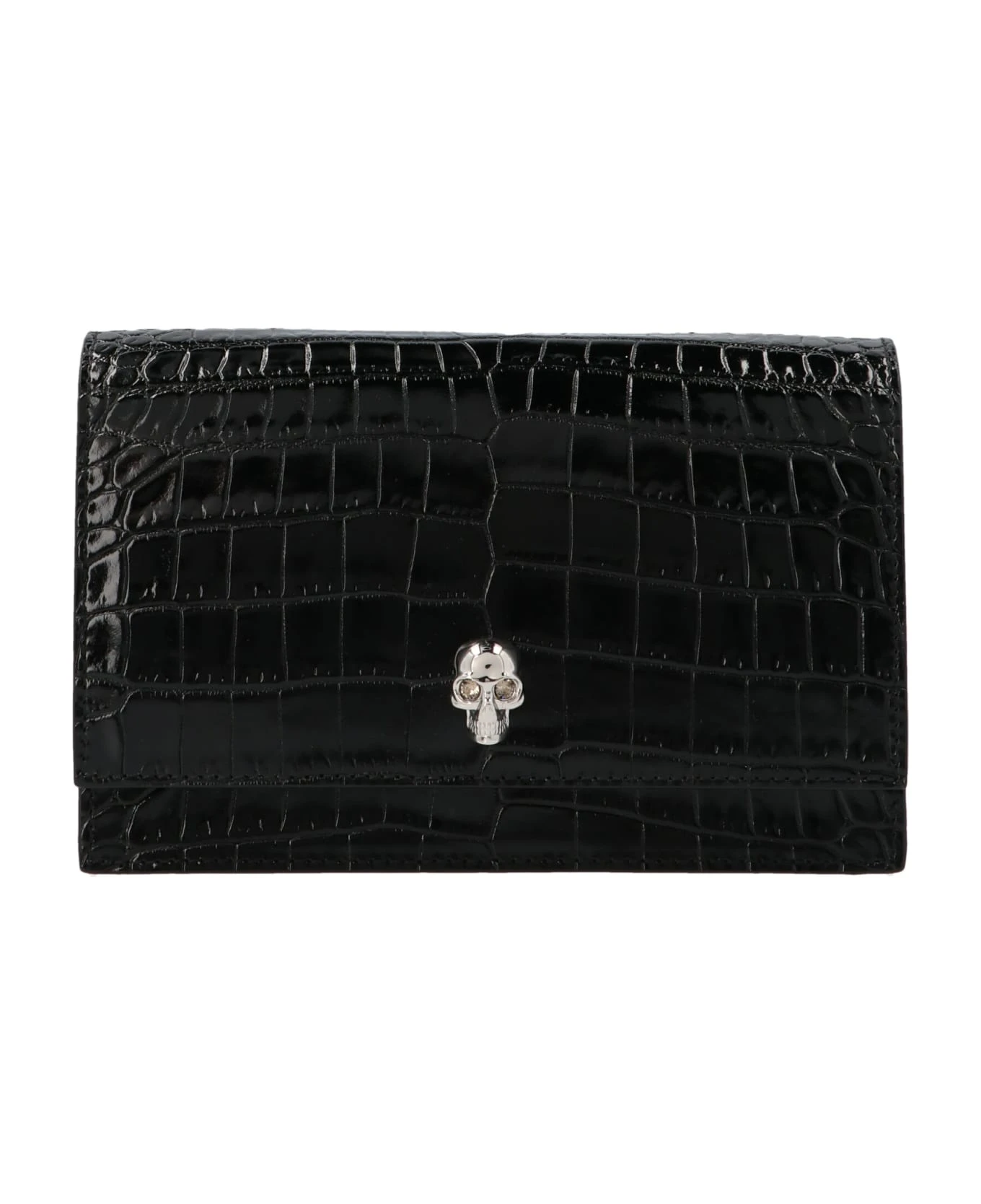 Alexander McQueen ‘Skull Bag’ mini crossbody bag in crocodile print leather with flap closure, skull, silver hardware and a chain shoulder strap.