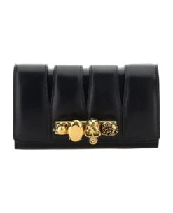 Calfskin slash shoulder bag by alexander mcqueen, an all-over padded design, a top flap with cut-out detailing, a front flap with a magnetic button closure, a single internal compartment, an iconic jewelled skull handle to the front, and a detachable chain shoulder strap.