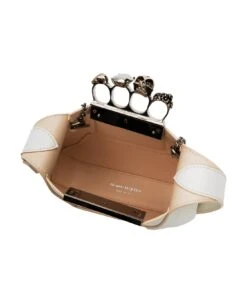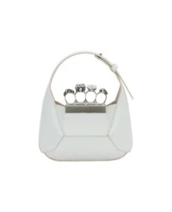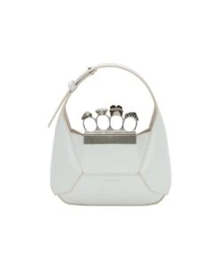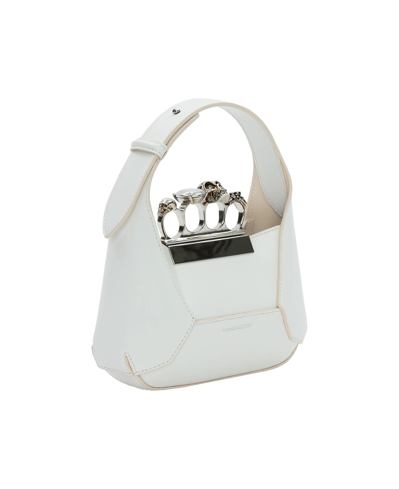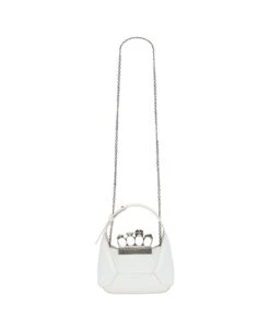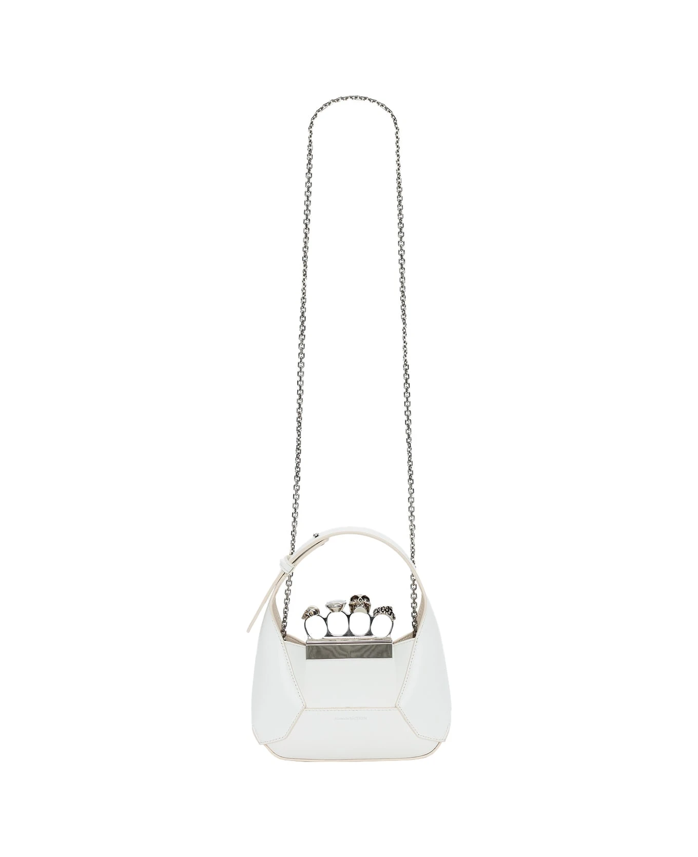 Mini Jewelled Hobo bag by Alexander McQueen made of soft ivory calf leather with an antiqued silver-tone metal handle, decorated with Swarovski crystal rings. The original silhouette of this bag, inspired by the faceted stones of the Knuckle model, boasts leather panels that have been cut and assembled together. The bag features a black lining, a magnetic closure, a single internal compartment, a removable chain strap (52 cm) and antique silver-tone brass metal hardware. The model can be worn hand-held, on the shoulder or cross-body thanks to the removable chain. Due to the appearance of the product, we recommend carrying it in your hand luggage when passing through airport security. For the same reason, we do not recommend carrying the bag in public places, such as courthouses and sports stadiums, where security checks may be carried out.