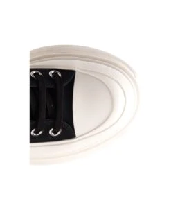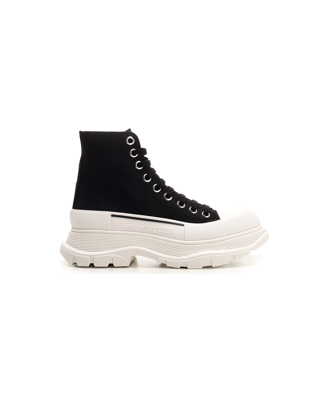 Black canvas “Tread Slick” ankle boot from Alexander McQueen featuring round toe, lace-up closure, logo embossed tongue, back tongue, white non-slip rubber sole and ankle height.