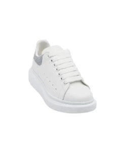 Oversized sneakers for women by Alexander McQueen crafted from white smooth calf leather with a contrasting snake effect print on the heel. Featuring a lace-up front fastening, white flat laces, an oversized white rubber sole and a silver-tone Alexander McQueen logo on the spoiler and front tongue. An extra pair of white laces is included. To reduce environmental impact and cotton consumption, the brand has decided to discontinue supplying the trainer bag.