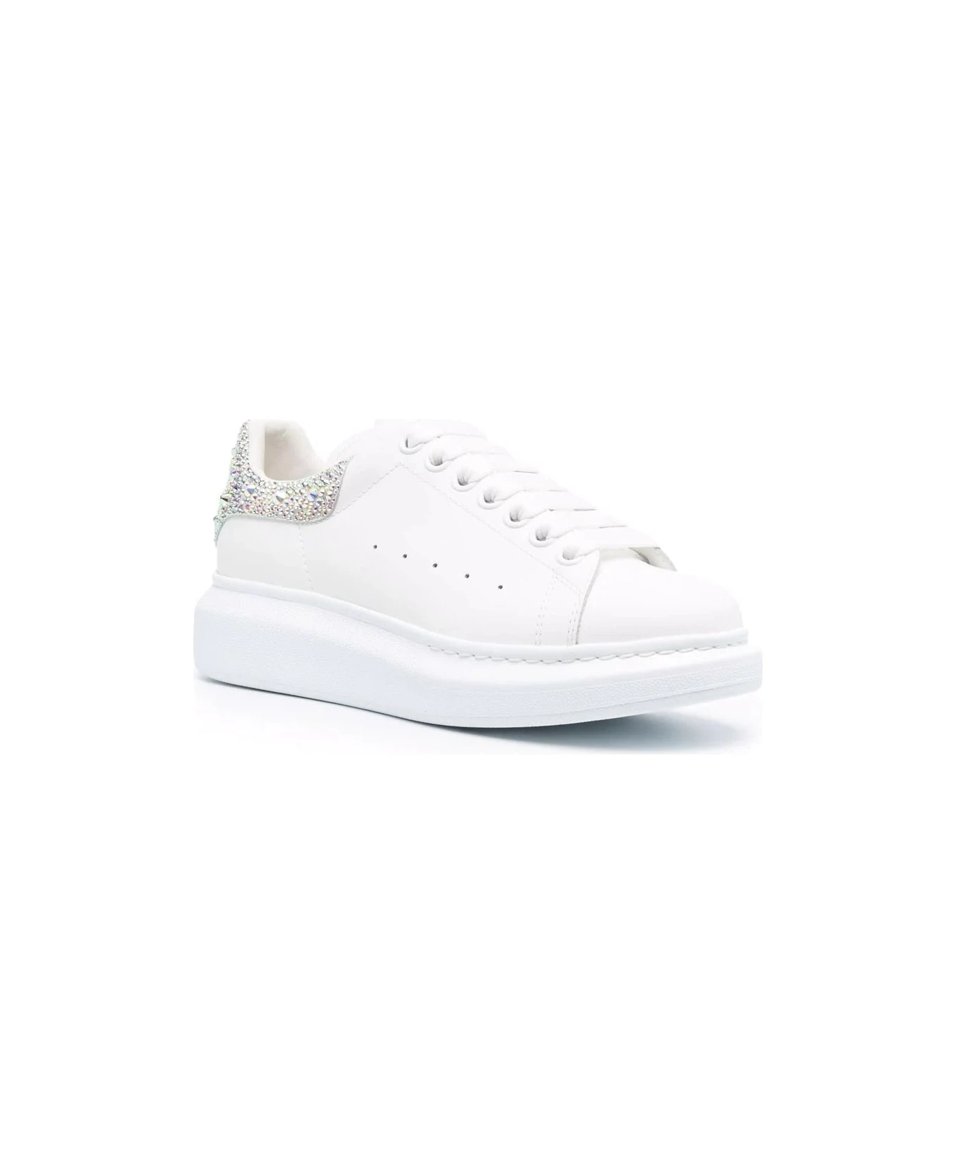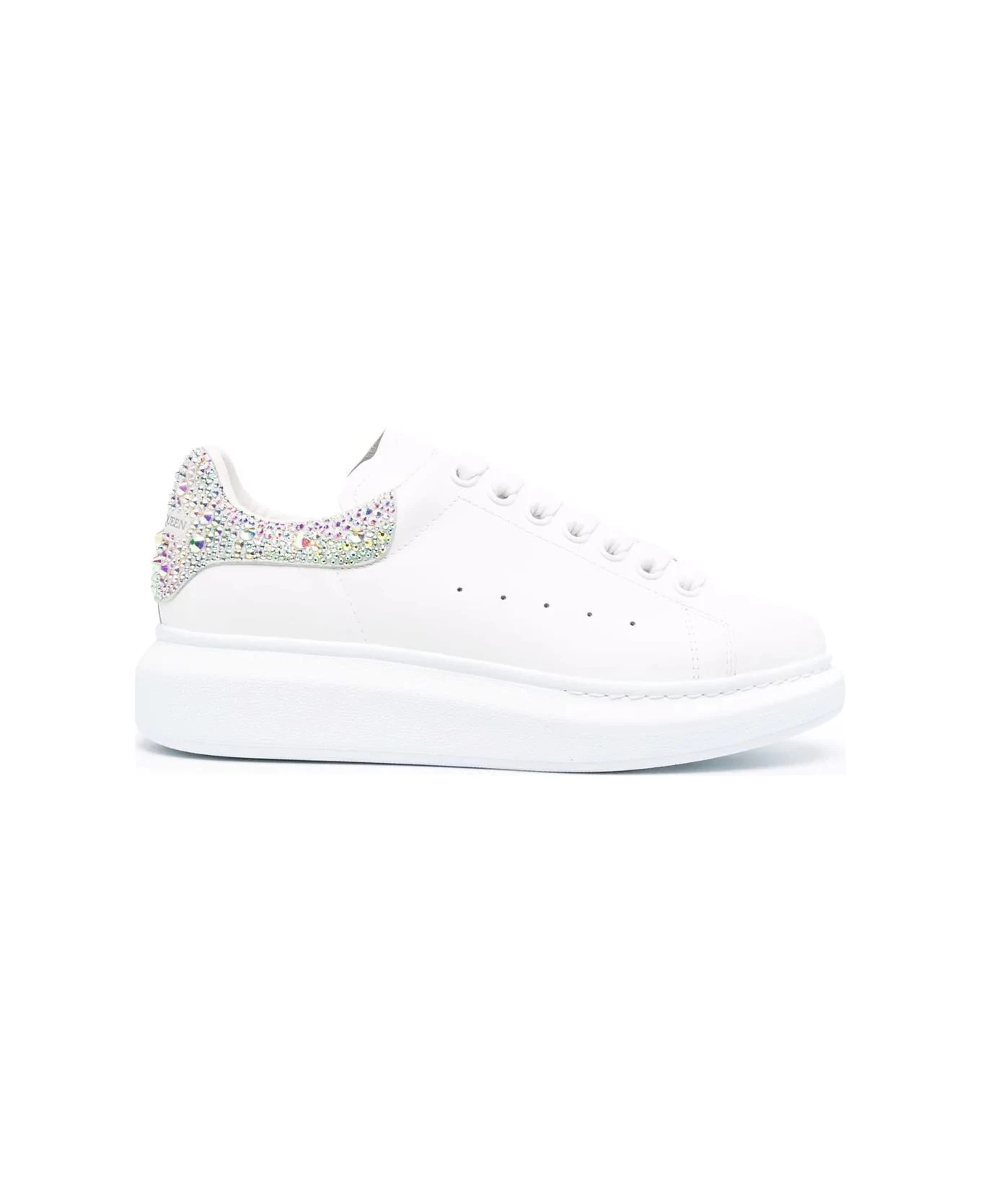 Oversize sneakers for women by Alexander McQueen made of smooth white leather with silver leather spoiler covered with bright tone-on-tone rhinestones. Model featuring a round toe, a lace-up design, flat white laces, an oversized white rubber sole and a silver Alexander McQueen logo on the spoiler and front tongue. A pair of extra laces included. To reduce the environmental impact and the consumption of cotton, the brand has decided to no longer provide the special bag for sneakers.