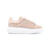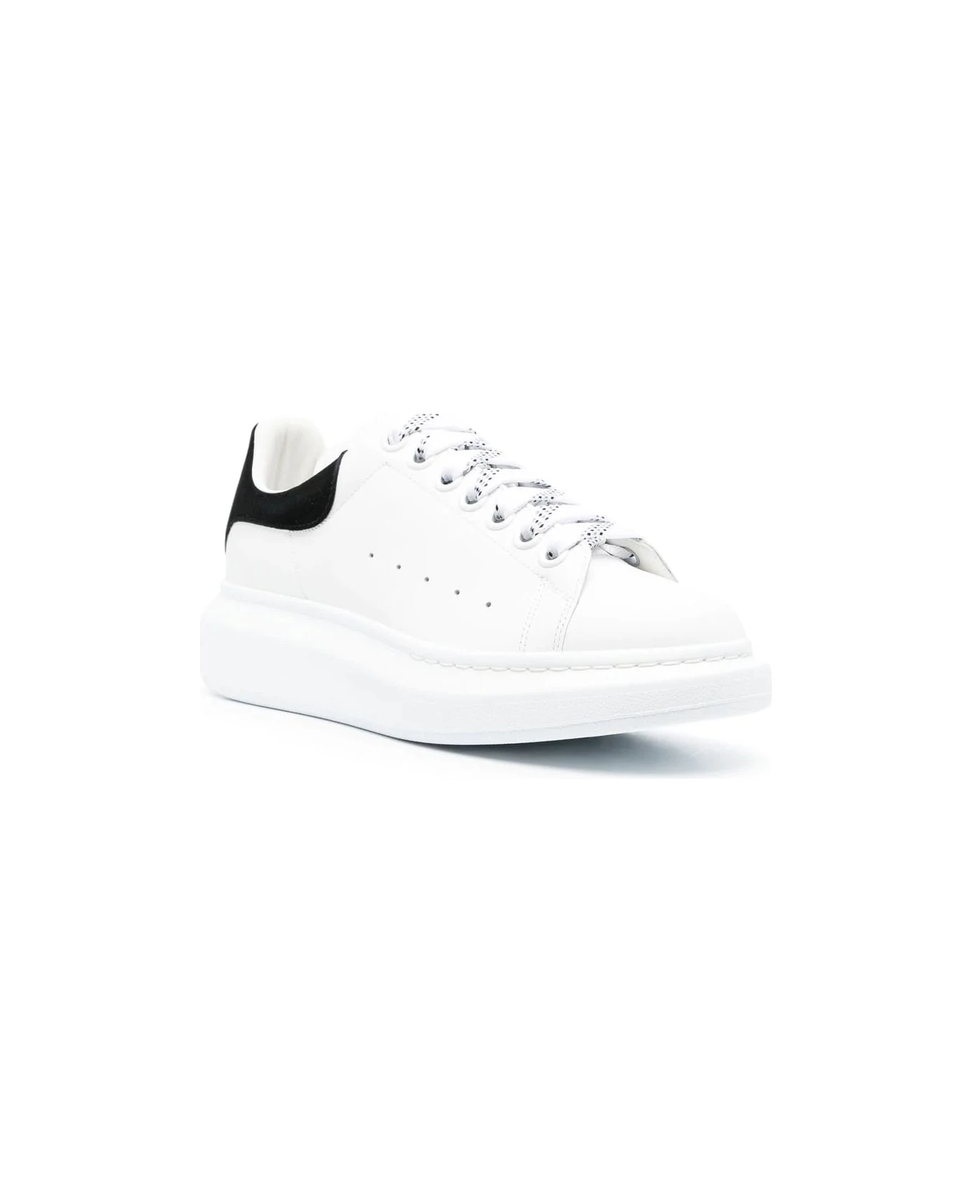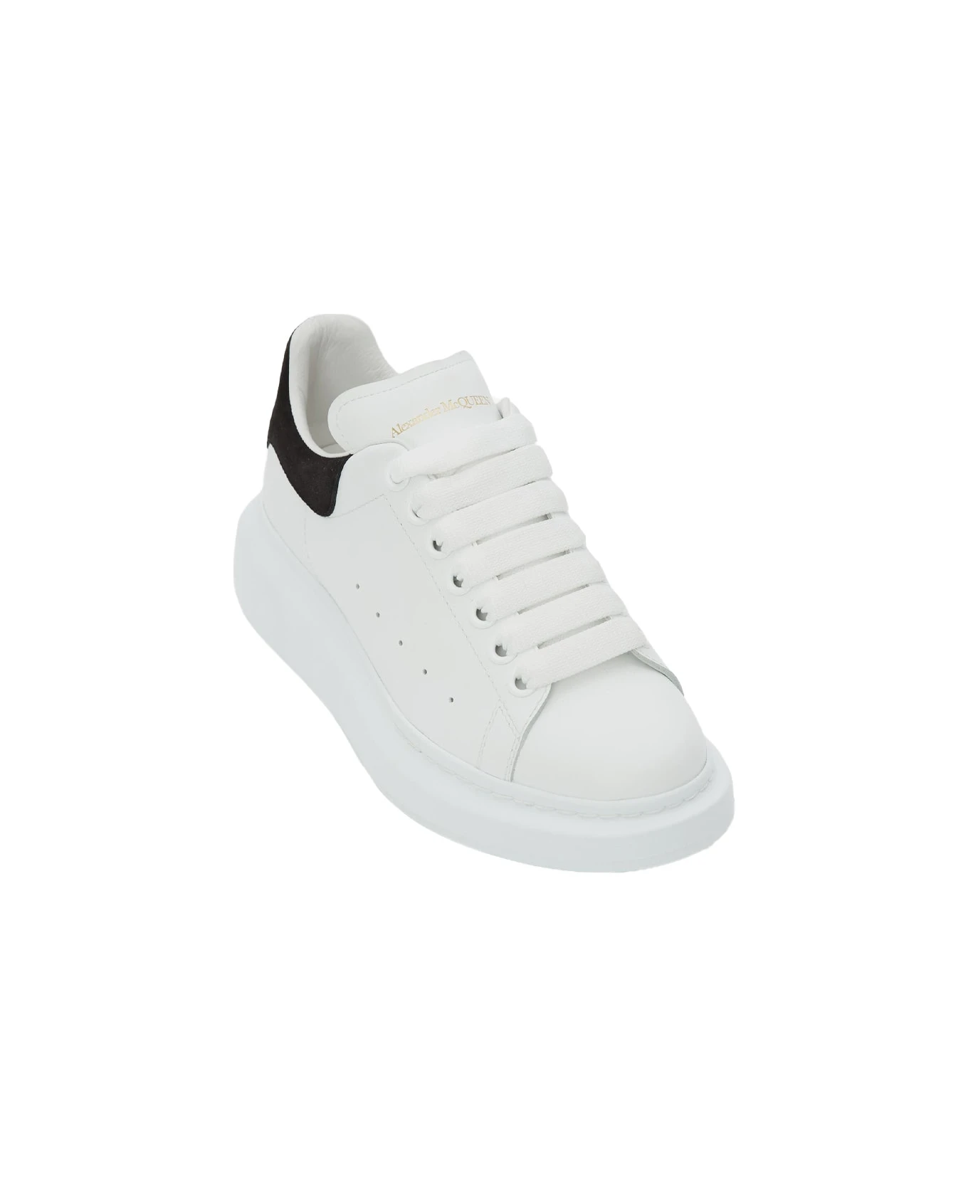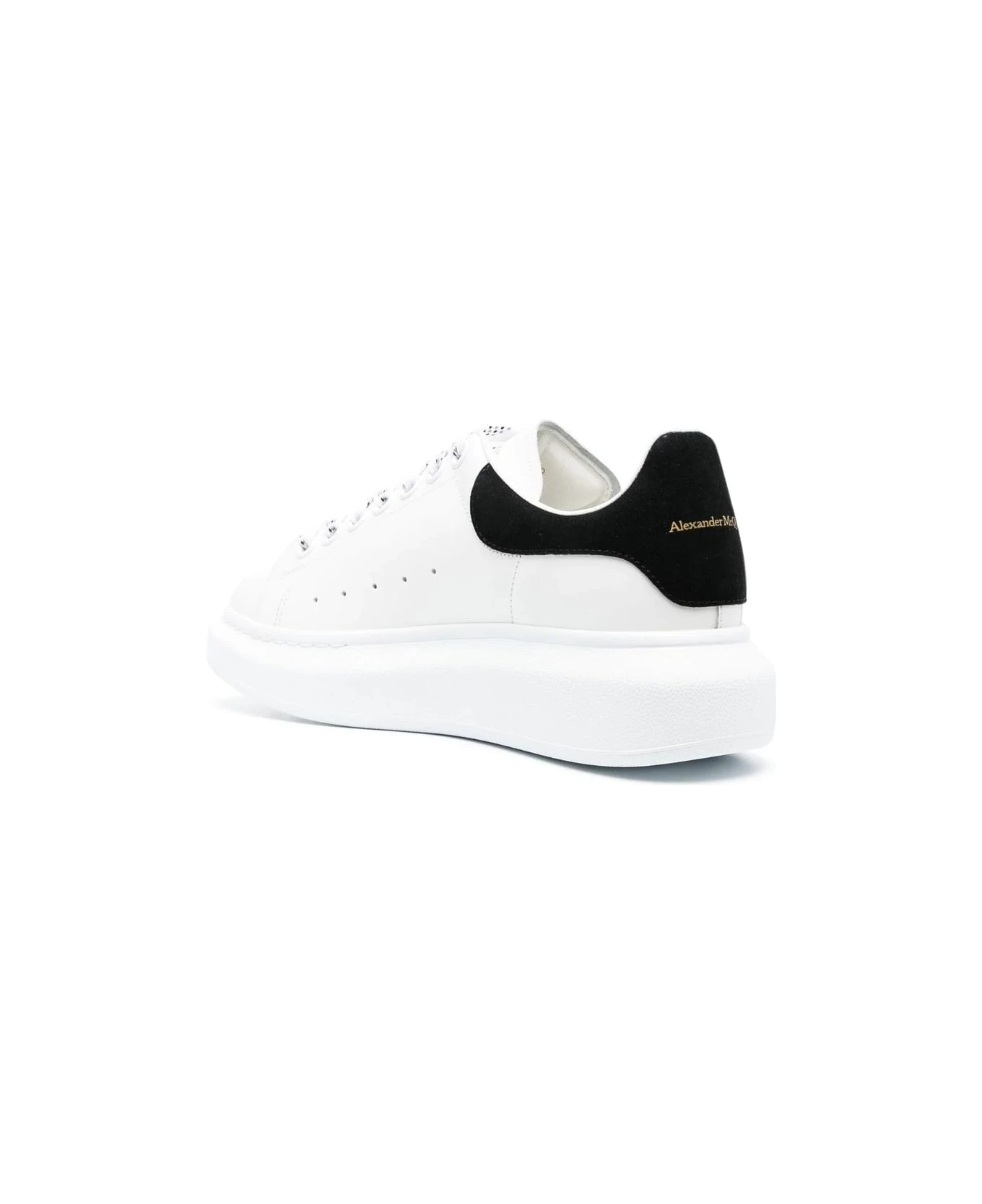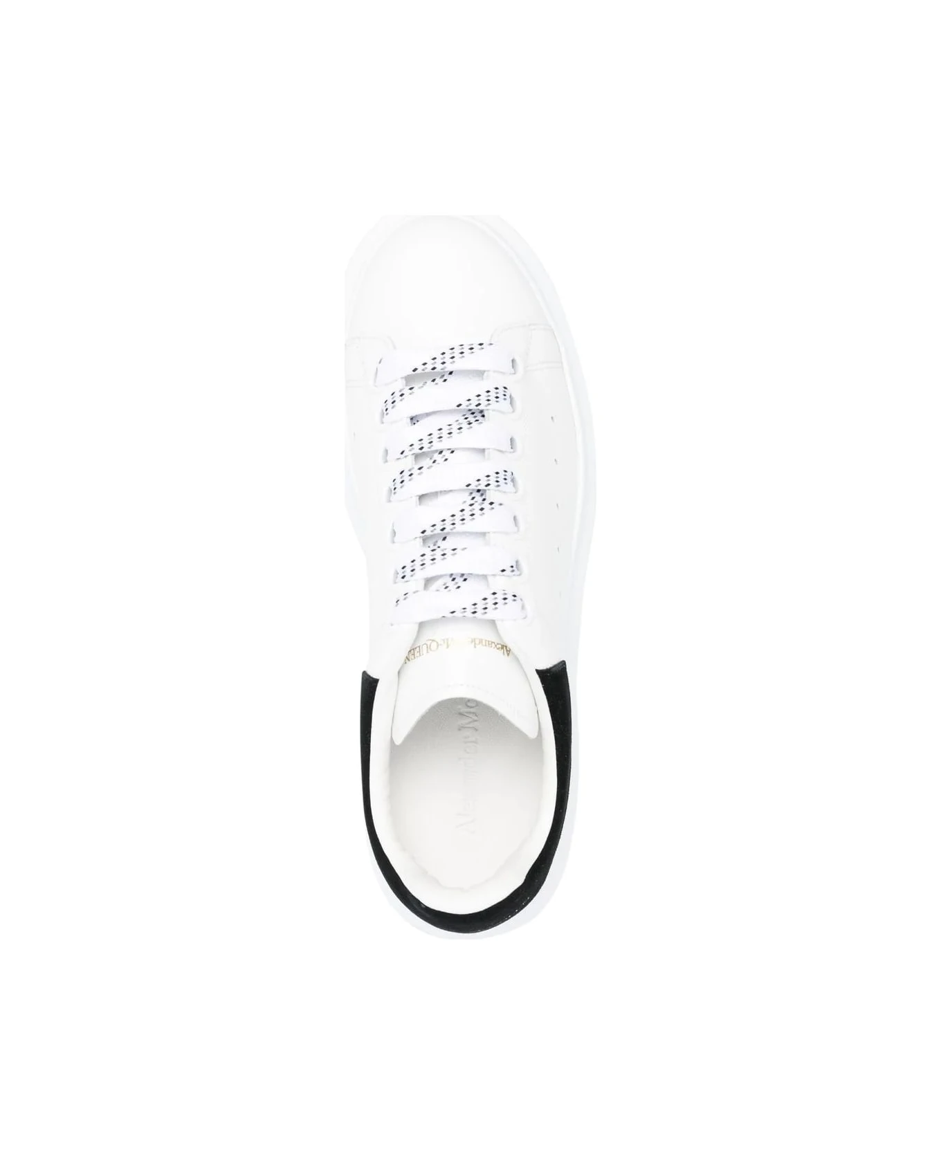 Oversized sneakers for women by Alexander McQueen made of smooth white leather with black suede spoiler enriched with golden Alexander McQueen logo. Iconic model of the brand characterized by round toe, front lacing, black and white wide flat laces, front tongue with Alexander McQueen logo and oversized white rubber sole. An extra white pair of laces included. To reduce the environmental impact and the consumption of cotton, the brand has chosen not to accompany sneakers with a dust bag anymore.