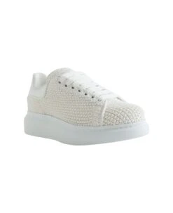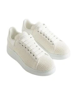 Oversized sneakers for women by Alexander McQueen featuring a textured white upper. Featuring a round toe, white flat laces, a thick rubber sole, and an Alexander McQueen signature on the tongue and heel. An additional pair of white laces is included. To reduce our environmental impact and cotton consumption, the brand will no longer provide a dustbag with our sneakers.