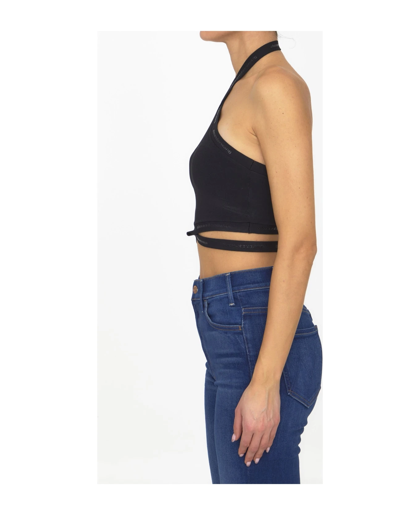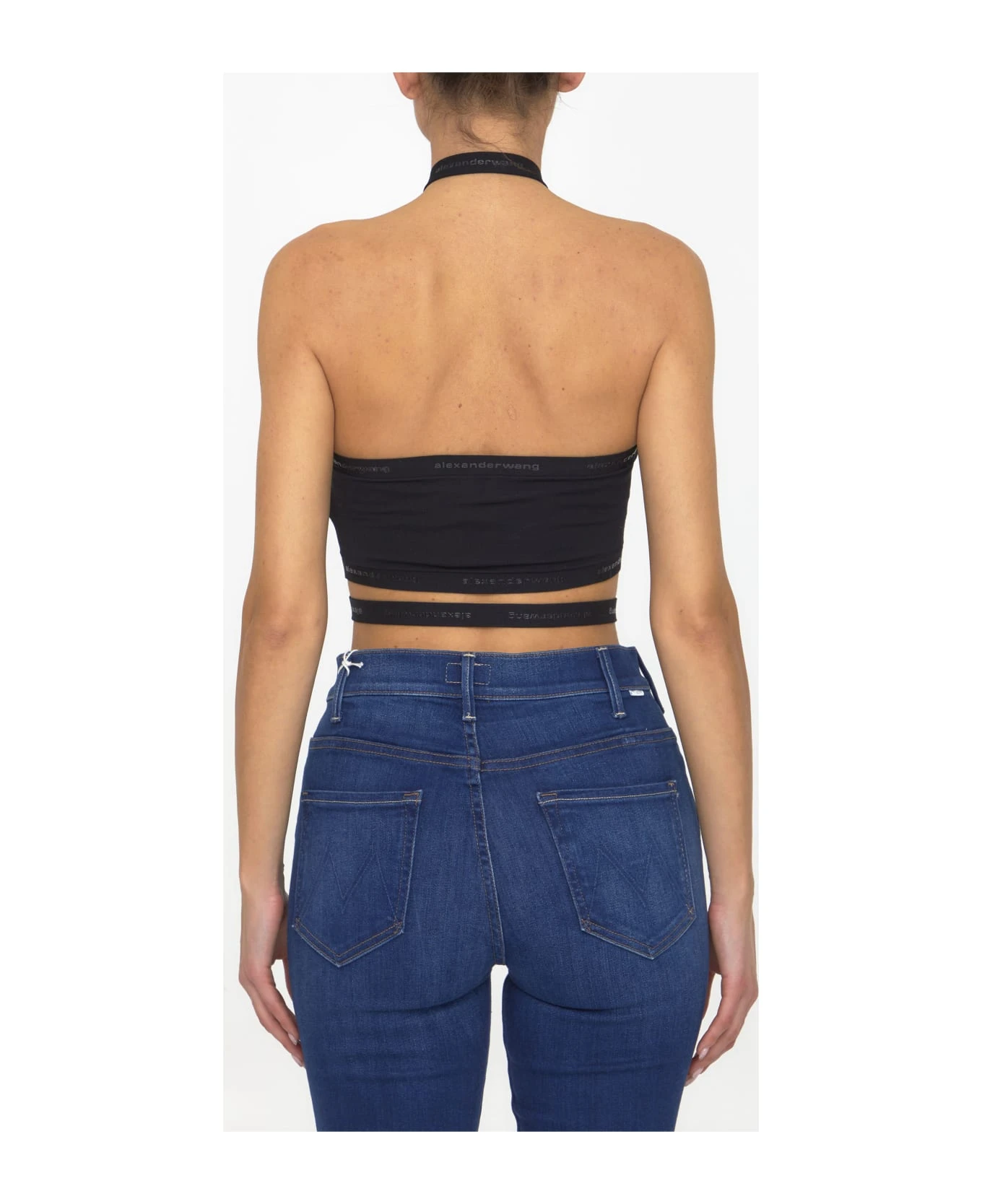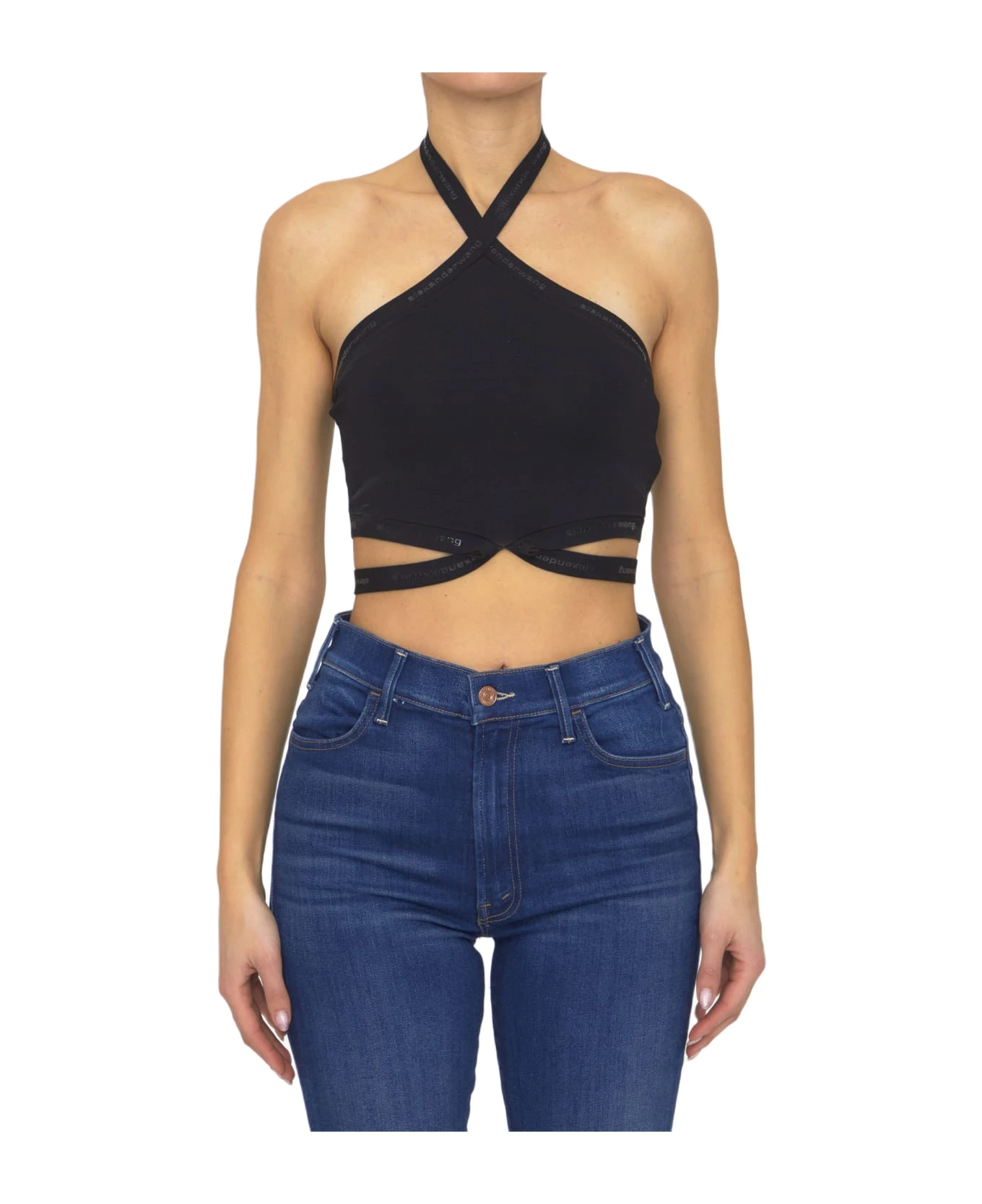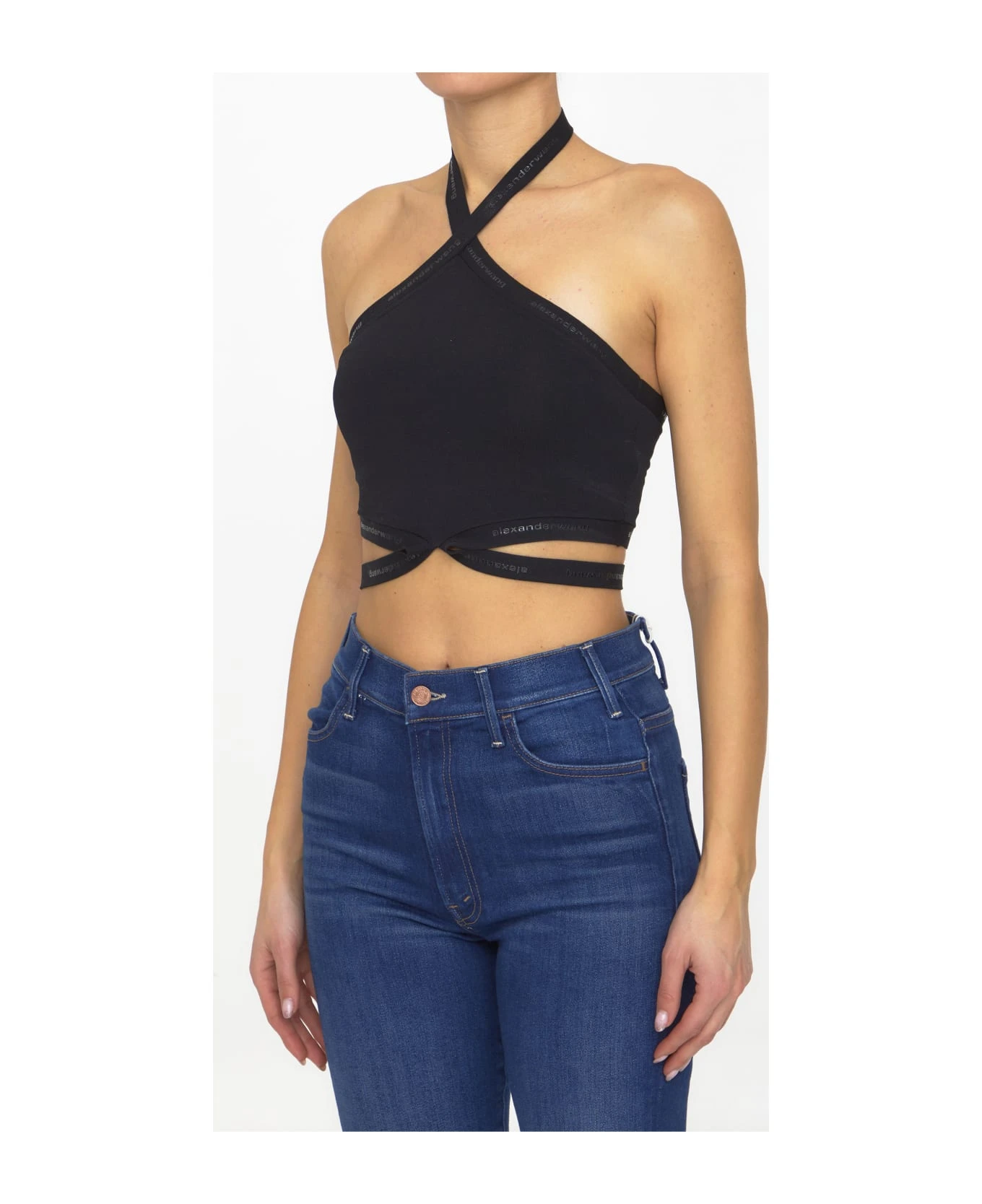 Crop top in black stretch viscose knit with criss-cross halter neck and criss-cross cut-out details on waist with repeated Alexander Wang logo. Fitted cut.