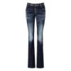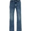 Cotton denim jeans with ribbed and elastic slip insert, zip and button closure, five pockets, leather logo tag, and wide leg.