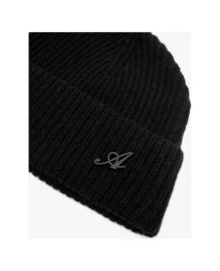 Black ribbed wool beanie with metal signature pin detail. Composition: 80% wool 20% nylon. Made in China.