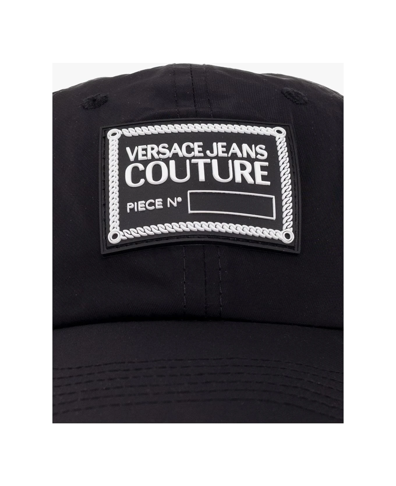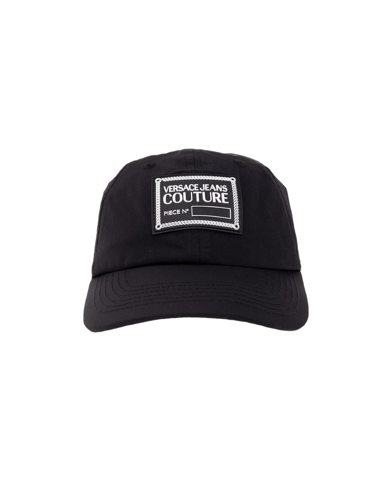 Black baseball cap from Versace Jeans Couture. Emblazoned with a black and white rubber logo patch on the front, this item features a back buckle adjuster.