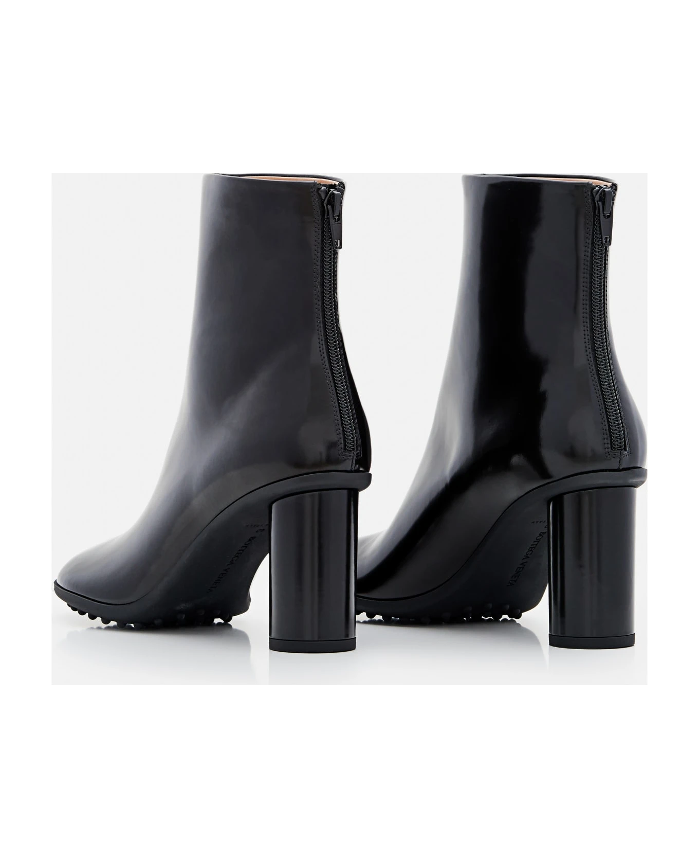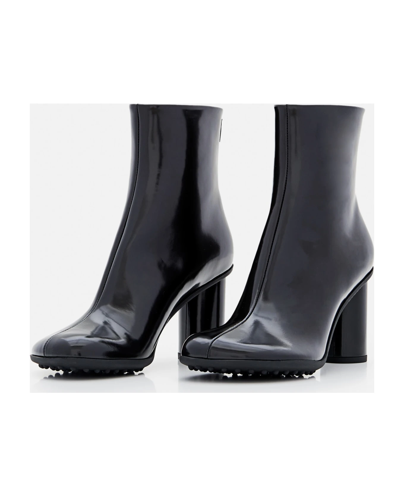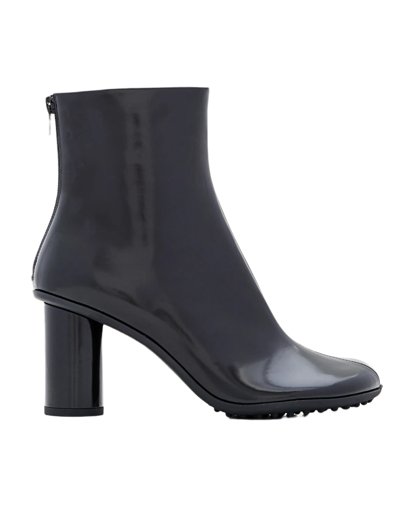Back zip closure. Patent finish latex upper. Rubber sole. Color: black.