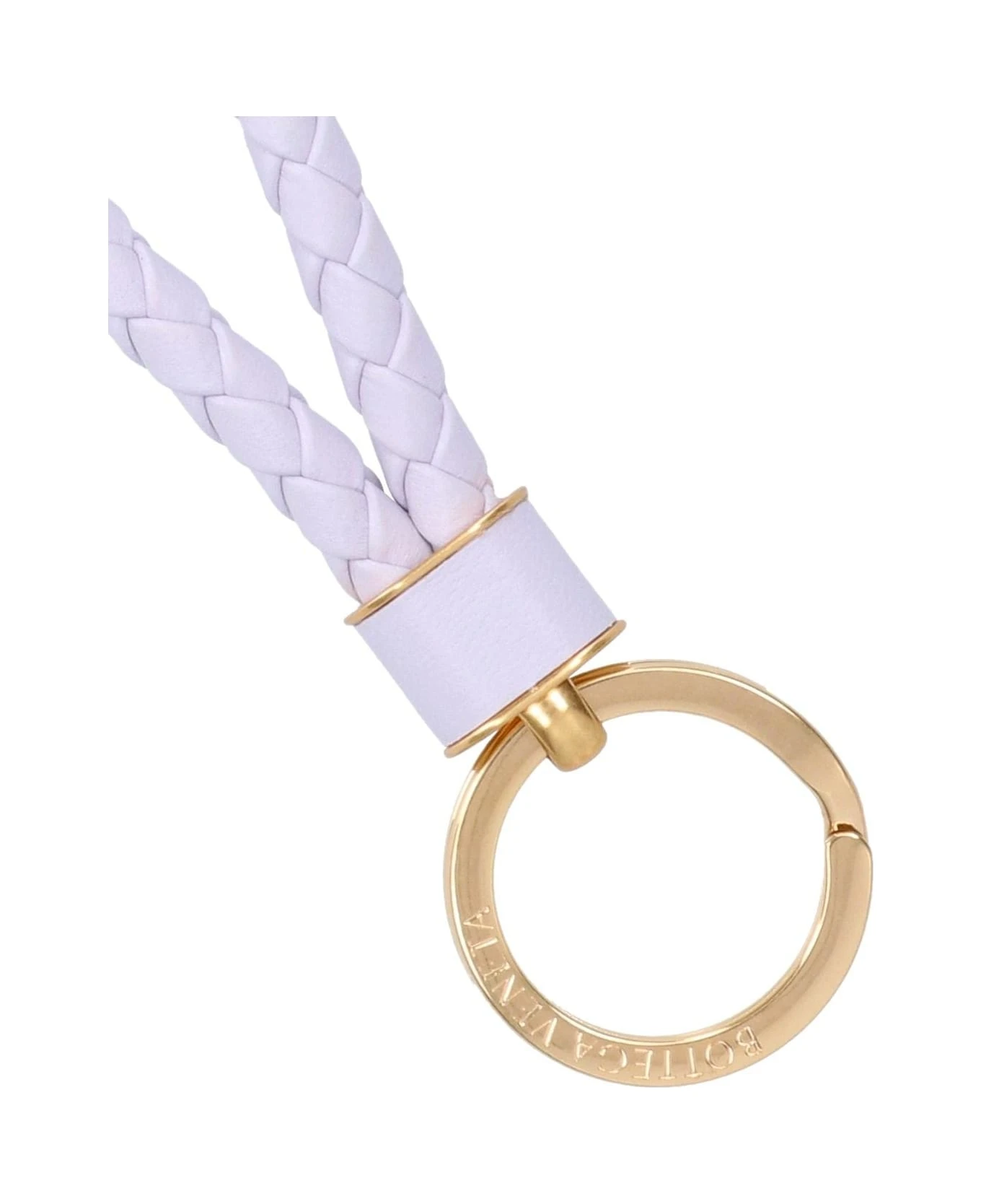 Bottega Veneta ‘Intreccio’ keyring in purple leather with lilac tone, iconic woven pattern, gold metal ring, engraved logo.