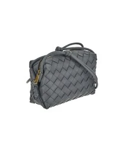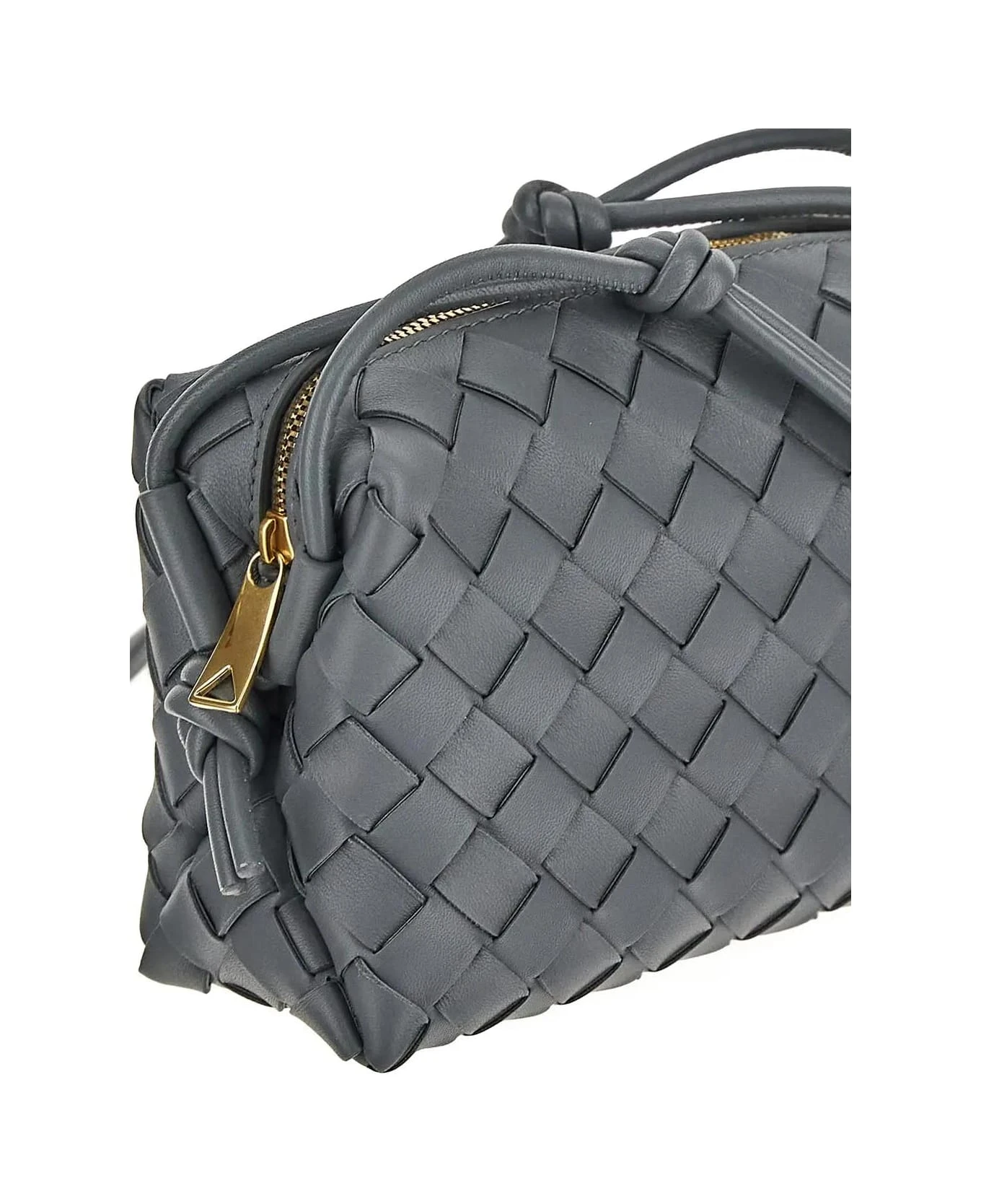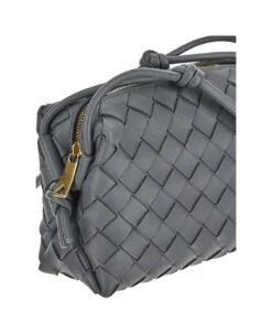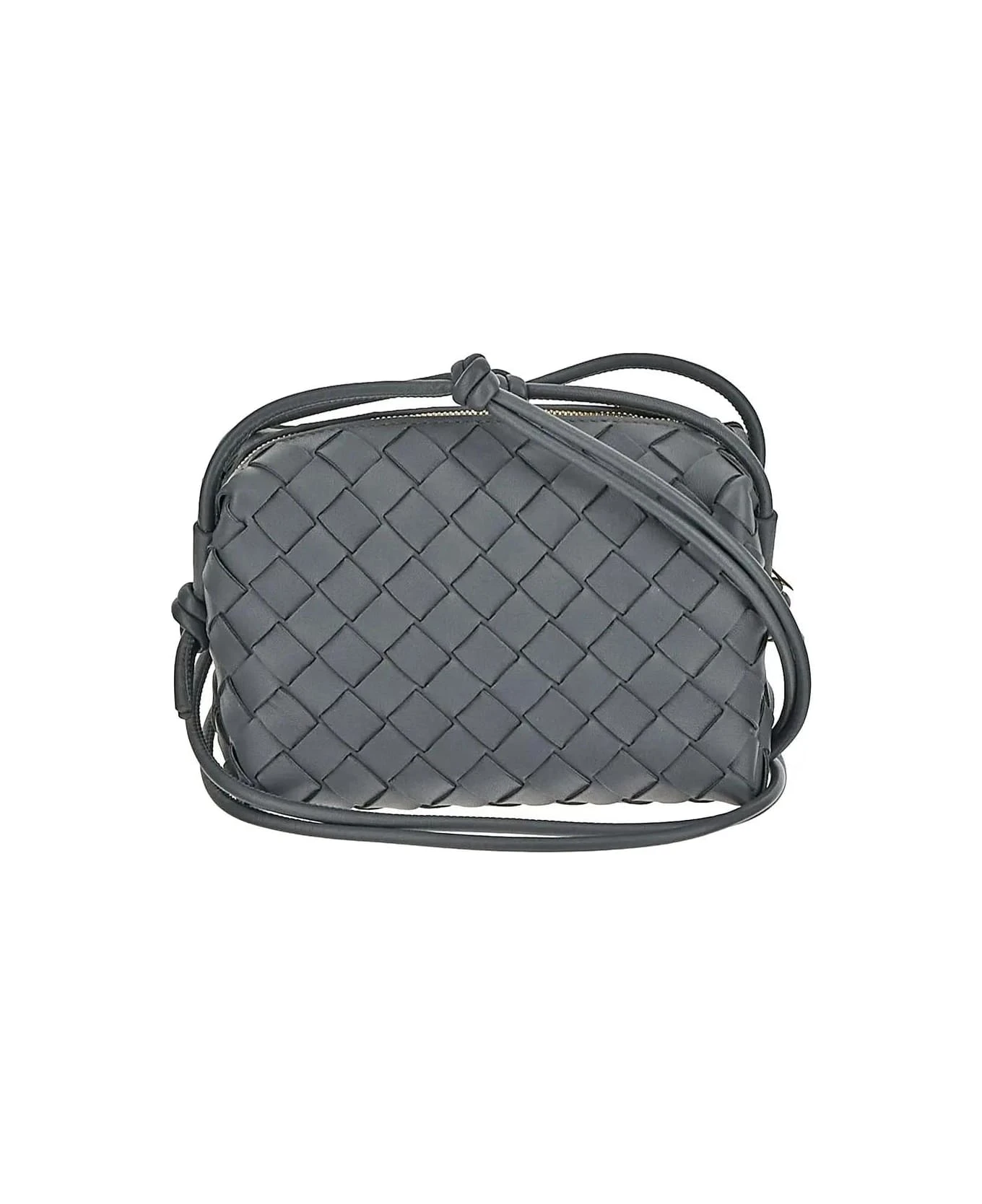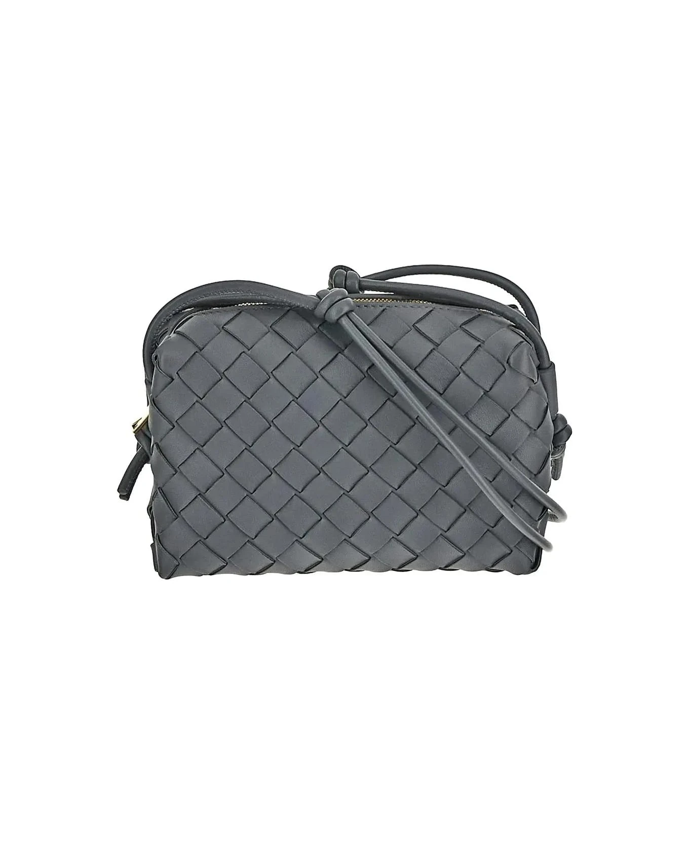 Bottega Veneta shoulder bag in grey leather with Intreccio design, tubular shoulder straps with knotted details, top zip closure, a main compartment and gold-toned metal hardware.