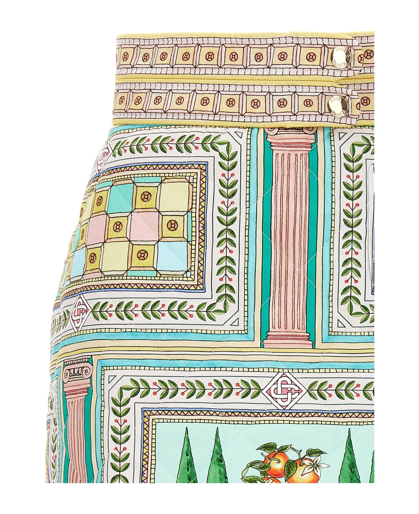 ‘Le Labyrinthe’ quilted satin skirt, all-over print, and back zipper closure.