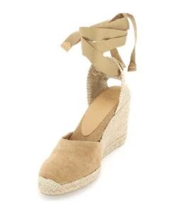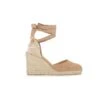 Carina handmade espadrilles by Castaner with front faded canvas upper and contrasting heel with ribbon tied at the ankle. Wedge covered in braided rope, canvas interior, rubber sole.