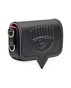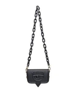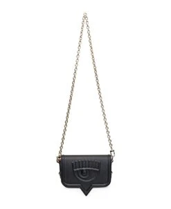 Black clutch bag. Removable shoulder strap in gold chain. Additional shoulder strap tone on tone. Internal pocket with zip. Closure with magnetic flap. Embossed logo on the front.