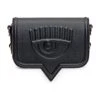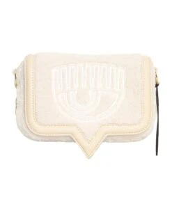 Synthetic fur and leather bag, flap fastening, logo embroidery, removable chain shoulder strap, logo