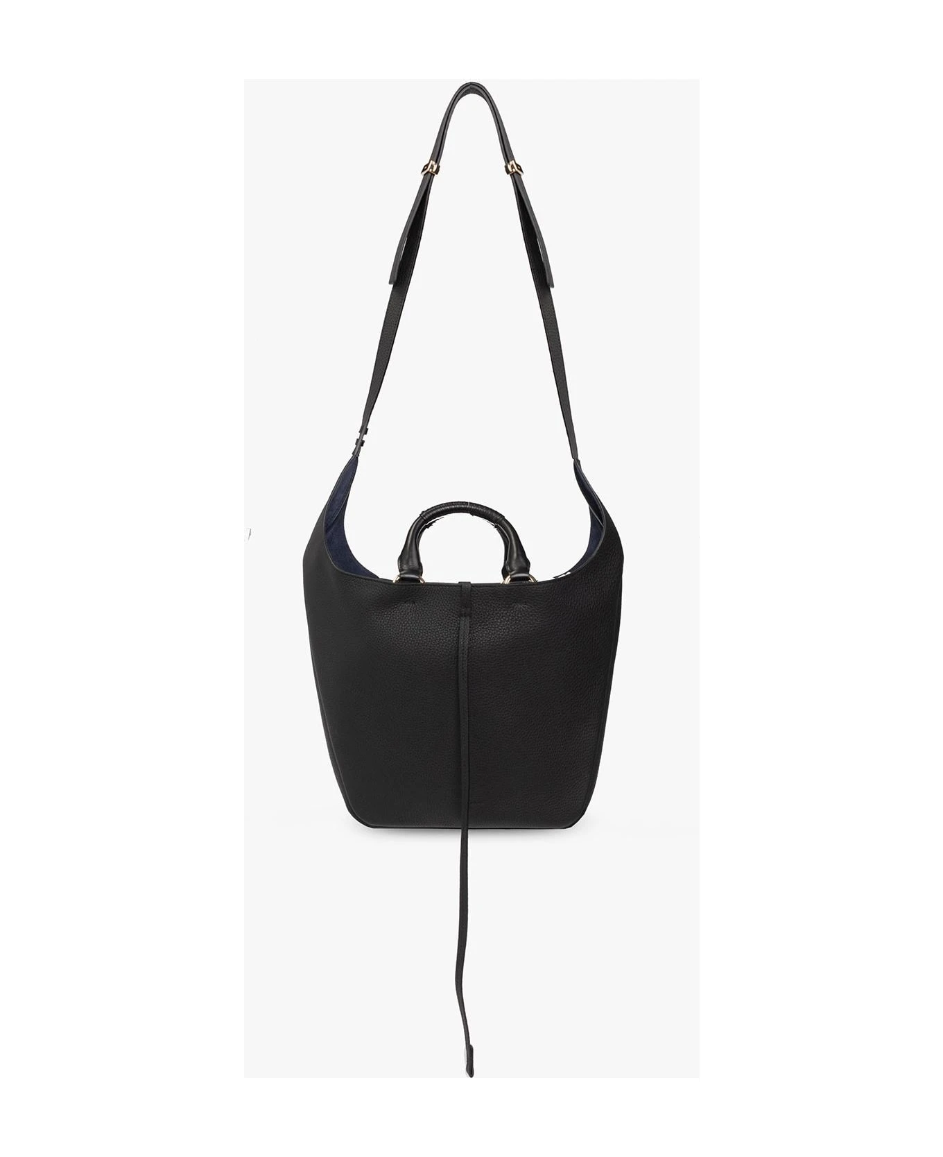 Black ‘Deia Medium’ hobo bag from ChloĆ©. Made of calf leather, this model fastens with drawstrings and is decorated with an embossed logo. It is complete with two half-round handles, woven handles, adjustable shoulder strap, gold-tone metal hardware and o