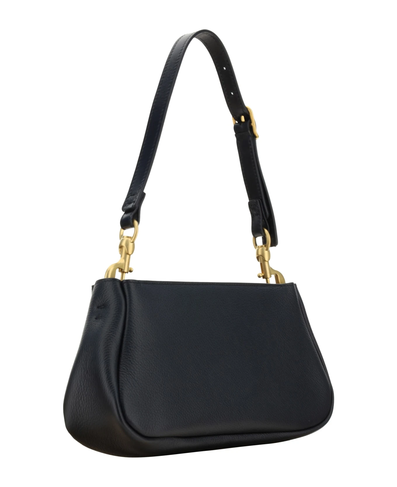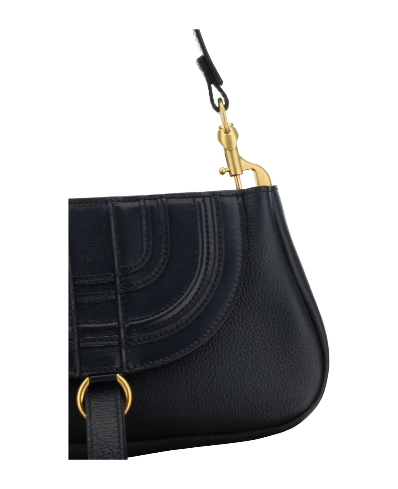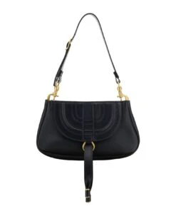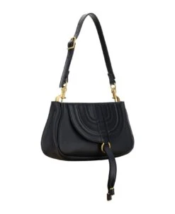 Calfskin marcie shoulder bag by chloé, grained leather design, removable and adjustable flat shoulder strap, single large interior compartment, interior slit pocket, top zipper closure, one interior zipper pocket, antique gold hardware, leather tassel detail applied to front.
