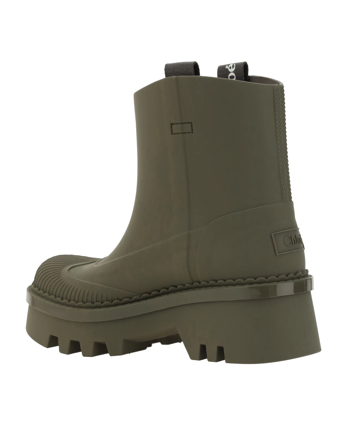 Raina boots by chloé, water-resistant design, rubber block heel, ankle-length model, double nylon puller for easy fit applied to side panels, monochrome pattern.