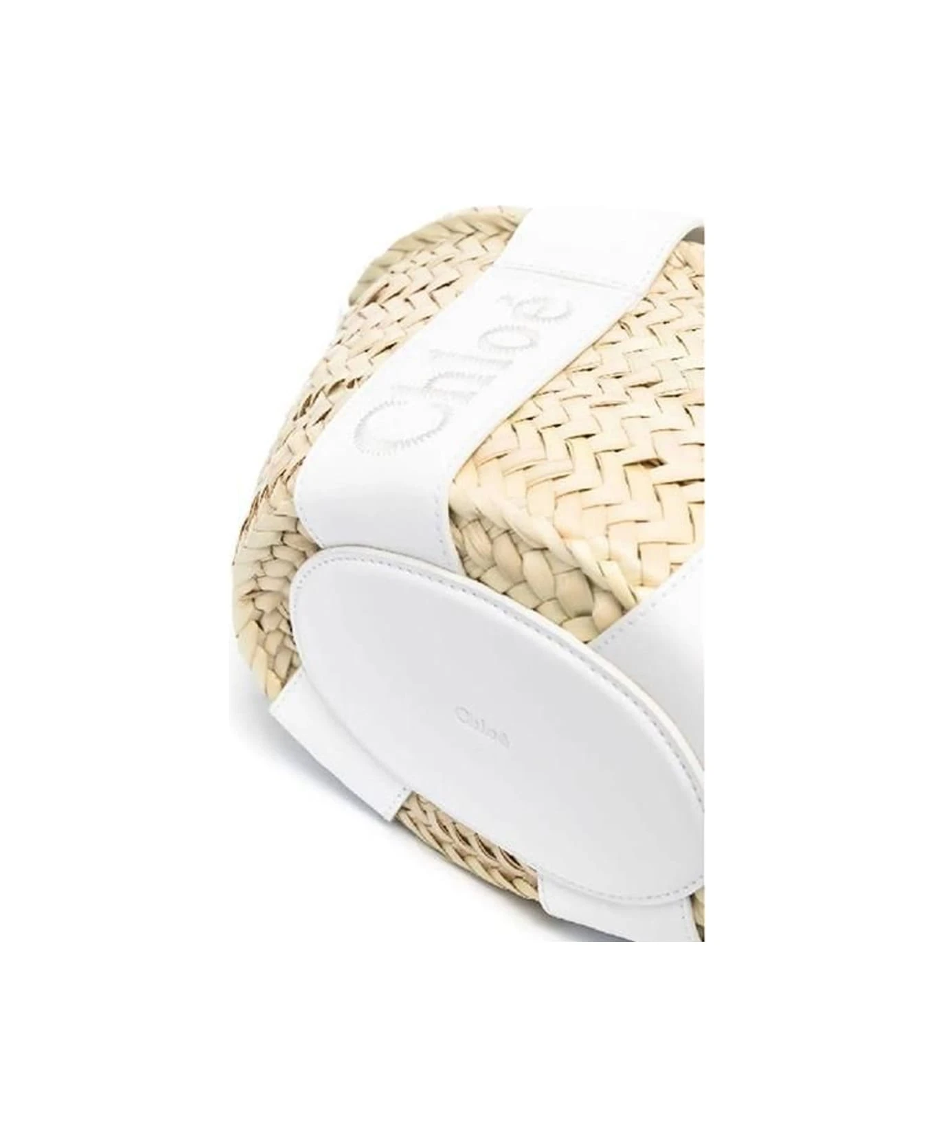 Sense small tote bag by Chloé made of natural raffia with white leather logo ribbons forming the two top handles. Model with single internal compartment and white leather ribbon closure.