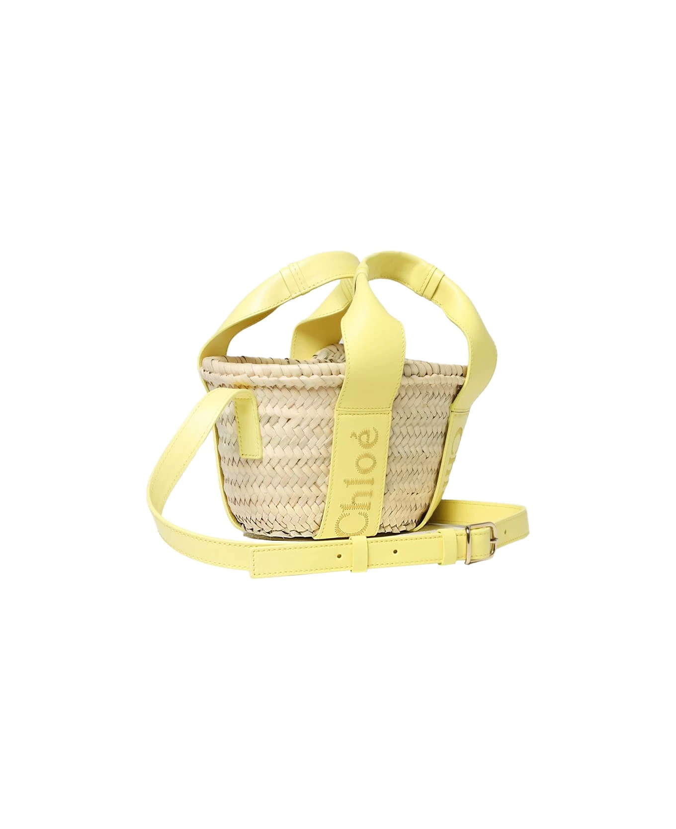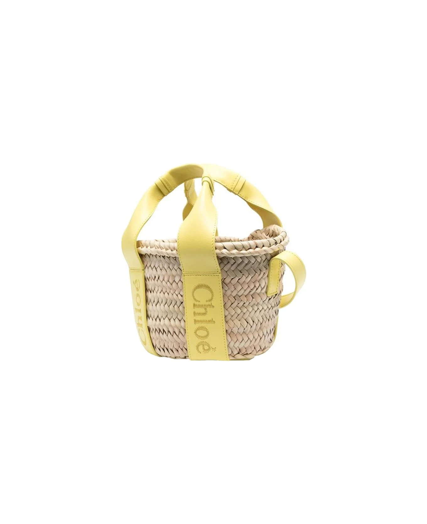 Sense small tote bag by Chloé made of natural raffia with yellow leather logo ribbons forming the two top handles. Model with single internal compartment and yellow leather ribbon closure.